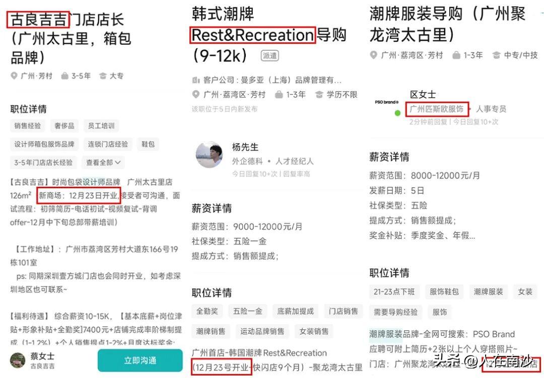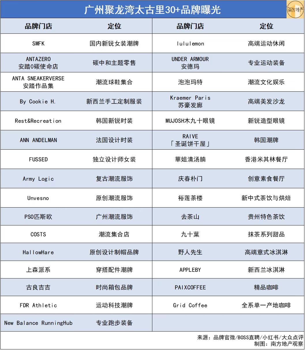 聚龙湾太古里首开区将于12月23日开街,一起来看看有没有你期待的新店吧! 目前有8家品牌已通过小红书、BOSS直聘、大众点评等渠道官宣。包括香港米其林餐厅華姐清汤腩、新西兰冰淇淋品牌APPLEB、RAIVE「圣诞饼干屋」、运动科技潮牌FDR Athletic、时尚箱包品牌古良吉吉、韩式潮牌Rest&Recreation、广州匹斯欧服饰、Kraemer Paris苏豪发廊,都宣布于12月23日开业。此外,还有多家品牌曝光,其中不少是广州首店。 需要注意的是,这次聚龙湾太古里首开区亮相,主要以快闪店、轻奢时尚以及餐饮品牌为主。大部分建筑都是临时搭建的建筑,计划在2028年起分阶段拆除重建。从多渠道公开信息来看,目前聚龙湾太古里已经引入了30+品牌。 据不完全统计,广州首店有10家:SMFK、ANTAZERO安踏0碳使命店、ANTA SNEAKERVERSE安踏作品集、上森派系、Rest&Recreation、COSTS潮流集合店、RAIVE「圣诞饼干屋」、華姐清汤腩、裕莲茶楼、APPLEBY。 好消息是广州地铁22号线后段即将在年内开通,开通之后,南沙人可以半个小时到达芳村站,之后换乘11号线一站就可以到达聚龙湾太古里,吃喝玩乐剁手并不是太麻烦了。