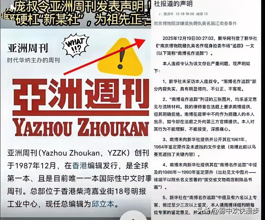 新华社这回踢到钢板了, 真没想到庞叔令这么刚,直接跑到《亚洲周刊》发声明回怼新华社。 新华社这几日遭到强硬而有力的回应,庞叔令也在《亚洲周刊》上发表声明进行反击,他指出新华社在发文之前并没有采访过他和其他当事人,就急于发文抹黑他。 庞叔令的那句“不公正、不理解、不接受”,像一把锤子砸在很多人心里。捐赠人家属的悲愤,隔着声明都能感受到。她最痛心的一点在于,新华社报道引为关键证据的鉴定和流转文件,正是她的律师在法庭上多次索要,而南京博物院(南博)拒绝提供的。一边在法庭上对捐赠人保密,一边却将材料交给媒体公开,这种做法让任何人都难以接受。 这场风波的起点,是一份跨越六十六年的信任。1959年,庞家将包括明代仇英《江南春》在内的137件家藏书画无偿捐给国家。当年的捐赠收据,代表的是一份沉甸甸的社会契约。然而到了2025年,庞叔令却在北京一场拍卖预展上,惊见这幅家传古画,估价高达8800万元。她回头去南博清点,才发现137件捐赠品中,竟有5件早已不知去向。 南博的解释是,这些画作经六十年代两次专家鉴定为“伪作”,于九十年代依规处置了。听起来程序完备。但魔鬼藏在细节里。1961年的鉴定意见写着“陈鎏题引首真”——这承认了画上至少有明代真迹。一件含有明代真迹的作品,为何被整体定为“伪作”并剔除?这个疑问南博至今没有向社会说清。 更蹊跷的线索埋在纸张的褶皱里。那份关键的“拨交省文物商店”文件,签署于1997年5月8日,签批人徐湖平时的职务是副院长。庞叔令在声明中尖锐质疑:副院长是否有权以院长名义批准上千件馆藏书画流出?她直接指出,此行为可能涉嫌犯罪,并公开要求调查。面对追问,现已退休的徐湖平先生表示“这个事没有经过我手,我不是书画鉴定家”。 那幅《江南春》的流浪轨迹,则勾勒出一个巨大的价格谜团。它于2001年从江苏省文物总店以6800元人民币售出,购买者仅记录为“顾客”。二十四年后,它在拍卖市场的估价达到8800万元。从六千八到八千八百万,这超过一万倍的价差,灼痛了公众的眼睛。即便它是伪作,这种处置方式是否足够慎重、透明? 南博代理律师曾援引《民法典》强调,捐赠后所有权已转移,馆方无返还义务。这话在法律逻辑上或许站得住脚,但却被第一财经等媒体批评为“钻法律空子的狡辩”,冰冷而寡义。法律是道德的底线。一座伟大的博物馆,不能只以不违法为行动准则,更应以赢得并呵护公众的信任为使命。南博的做法,被指“虽然可能没有触犯具体法条,却违反了社会默认的受捐者义务,突破了公共信任的底线”。 这件事真正让人脊背发凉的,是一个普遍的担忧:如果连庞家这样有清晰捐赠记录、有社会能量的家族,维权都如此艰难,普通捐赠者的权益又将置于何地? 这次风波撞击的,是整个文物捐赠体系的信任基石。今天受损的是庞家,明天寒心的可能就是所有愿意将私藏化为公器的潜在捐赠者。 令人稍感宽慰的是,事件已引起有关部门重视。江苏省文旅厅已牵头成立工作专班进行调查。这不再是南博与一个家族之间的纠纷,而是一起关乎公共文化机构公信力的严肃事件。公众期待一个超越部门利益的、彻底透明的调查。那五幅画作的确切流向,当年的鉴定与处置程序是否完全合规,必须有一个经得起历史检验的答案。 文物是民族的文化记忆,捐赠是公民向国家托付这份记忆的崇高行为。这份信任,比任何一件单体的文物都更为珍贵。博物馆的库房,保存的不仅是器物,更是人心。处理“伪作”或有规程,但处理公众的信任,没有“剔除品”,也绝不能“调剂”给无名无姓的“顾客”。 各位读者你们怎么看?欢迎在评论区讨论北京新闻周刊 周刊杂志 中国副刊 中央周刊 。