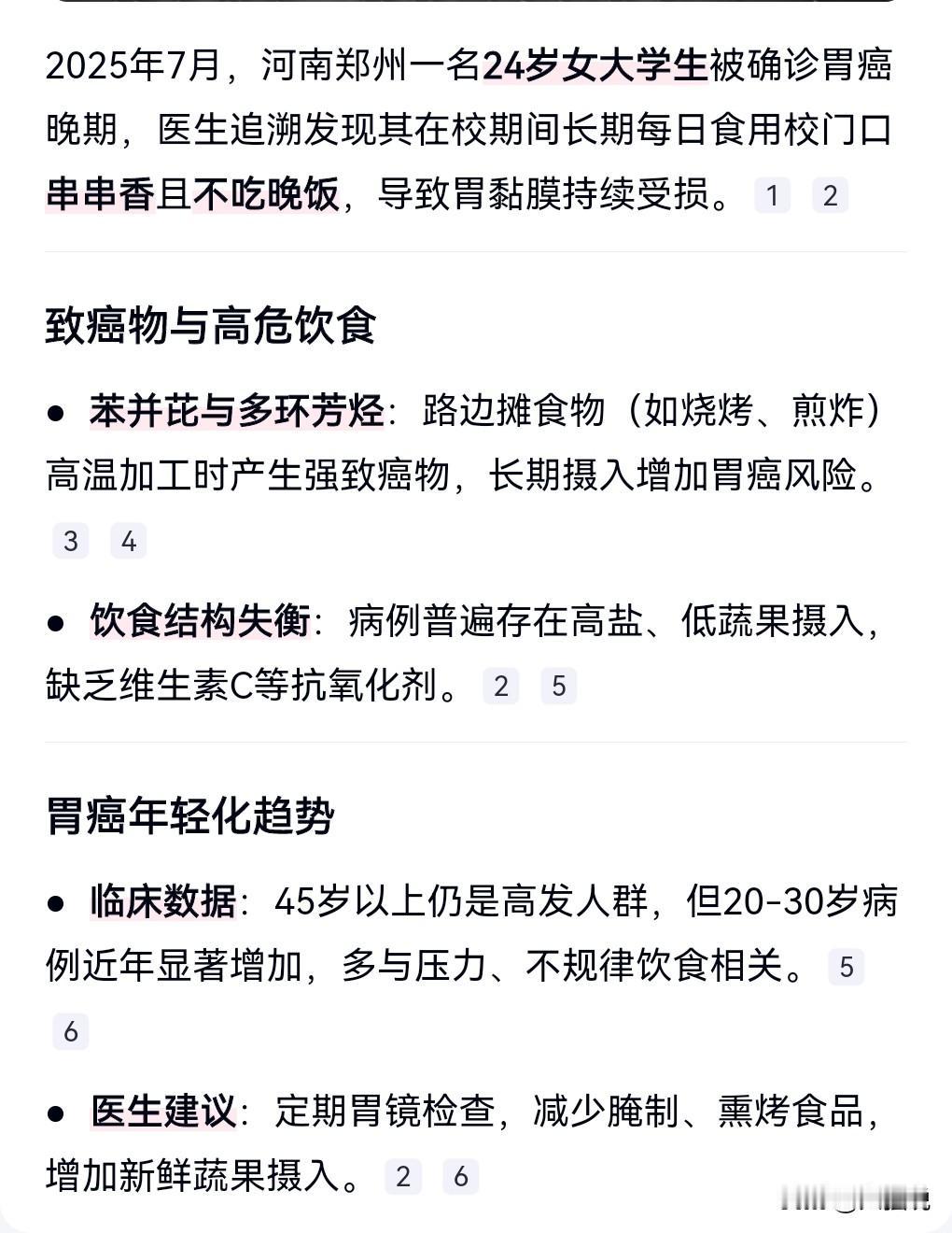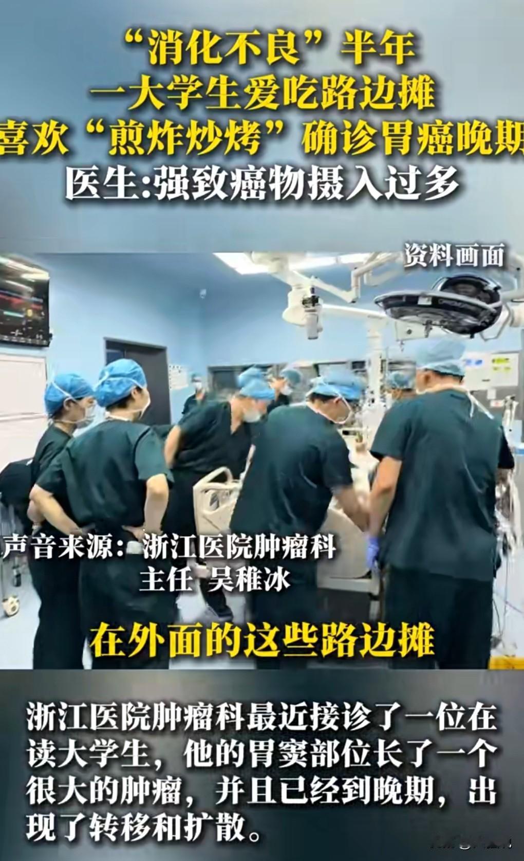 身体是革命的本钱,有很多人吃饭不规律,导致年纪轻轻的胃病缠身。 2025年7月河南,一女大学生爱吃路边摊确诊胃癌晚期。 她经常吃串串香,不吃晚饭。 结果导致胃黏膜持续受损。 这真的是太悲剧了。 还是要饮食清淡了,少吃点不健康的食品,真不能吃太多,偶尔吃一下还行。 多吃水果蔬菜,听妈妈的话那是真没错。