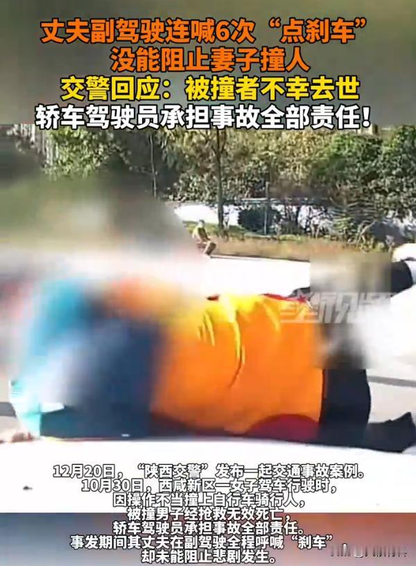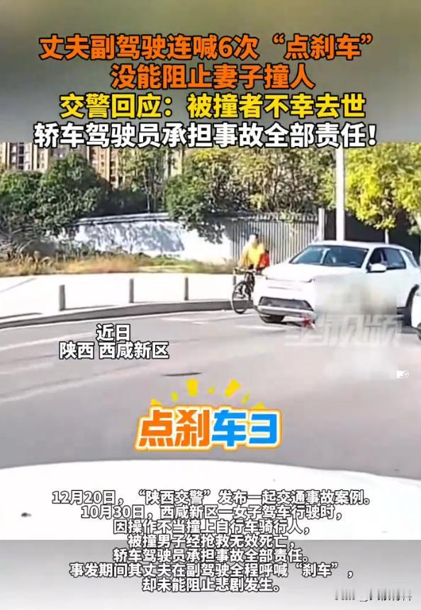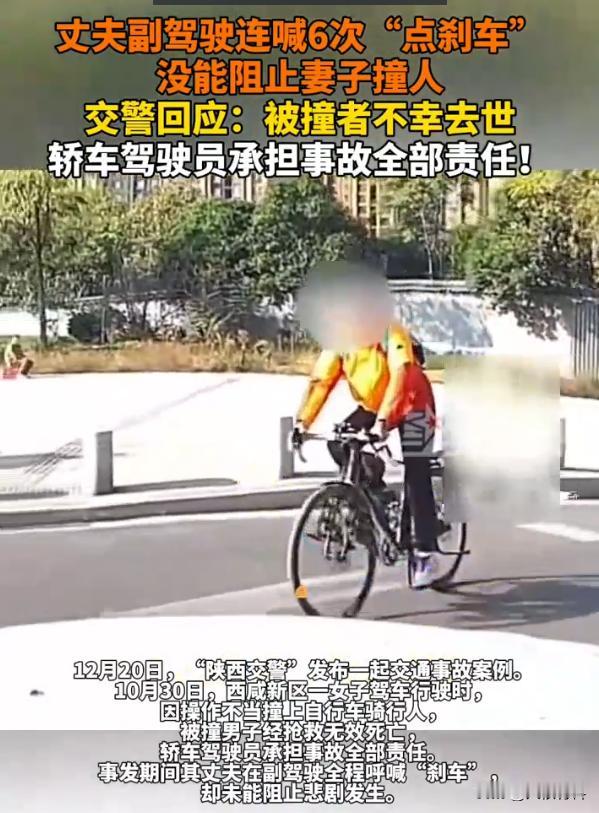 “悲剧还是发生了!”10月30日,陕西西安,一女子开车时,因为操作不熟练,车辆失控朝路边拱去,她丈夫坐在副驾驶上连喊6次“点刹车”,也没能阻止她,最终将无辜路人撞死。交警:轿车驾驶员承担事故全部责任! 据报道,这名女子刚刚考下来驾照,没什么驾驶经验,于是这天她驾驶家里的轿车上路,特意让多年驾龄的丈夫坐在副驾驶上,万一遇到啥紧急情况,丈夫能帮忙指导她。 结果刚上路没开多久,在一个丁字路口转弯时,该女子因为操作不熟练,竟然把车开到了对向车道,丈夫在旁边着急地大喊,让她踩刹车,连续喊了六遍,女子慌张之下没有踩下刹车,车子失控地开到了非机动车道上。 更不巧的是,这时恰好有一位路人骑着自行车经过,轿车直接把这名男子撞倒,卷进车底,这时轿车才缓缓停下。 经过紧急抢救,该男子还是不幸离世了,交警在查看了现场、路口监控以及行车记录仪的画面后,判定驾驶轿车的女子对这次事故承担全部责任。网友:路人无妄之灾! 大家在刚拿到驾照,或者平时很少开车,没什么驾驶经验的时候,要是想开车上路,一定要在“老司机”的陪同下,选一条车流比较少的路段,先练习一下,遇事不要慌,冷静听人指挥,避免酿成大祸。 信息来源:《丈夫全程呼喊"刹车",妻子仍操作不当撞死路人,详情披露》掌闻视讯