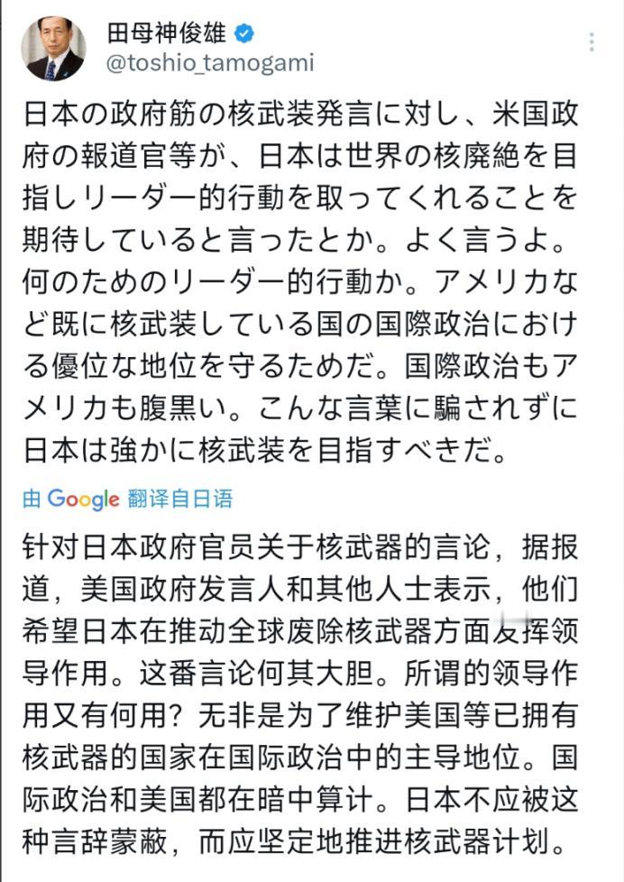 12月22日,日本极端右翼政客、航空自卫队前参谋长田母神俊雄发文:“美国政府发言人和其他人士表示,他们希望日本在推动全球废除核武器方面发挥领导作用。所谓的领导作用又有何用?无非是为了维护已拥有核武器的国家在国际政治中的主导地位。都在暗中算计。日本不应被这种言辞蒙蔽,而应坚定地推进核武器计划。” 说白了,日本这次可不是“无心之言”,而是极右翼势力亲手撕开了核野心的遮羞布。 要知道,日本可不是在“空喊口号”,而是早已在这件事情上做好了铺垫,他们自己国家一直都堆放着核武器的制作材料,甚至其他国家还堆放着更多。单单只是日本本土堆放分离钚,就可以制造几千枚原子弹,远超多数合法拥有核武器国家的核武器库规模,更别说其他国家还有堆放。 并且日本已经掌握了核材料的提炼、裂变技术与设备,还具备固体火箭与发射技术,只需要科研一年半载,大概率就能制作出来,可以说现在只缺最后一步的政治决断了。 说实话,美国政府现在的提醒,是看出了日本现在的核松动的迹象,是美国在害怕日本研发核武器,毕竟美国当年给日本制造的灾难持续到了现在,日本并向美国展开报复,日本也最擅长偷袭,珍珠港事件就是最好的证明。 说到底,虽然日本有了核武器制作的想法,也有核武器制作的能力,但是世界各国都不会允许日本制作核武器,如果允许了日本制作核武器,那就相当于把命交在了日本手里,所以日本的核武器拥有,就只能停留在幻想阶段。