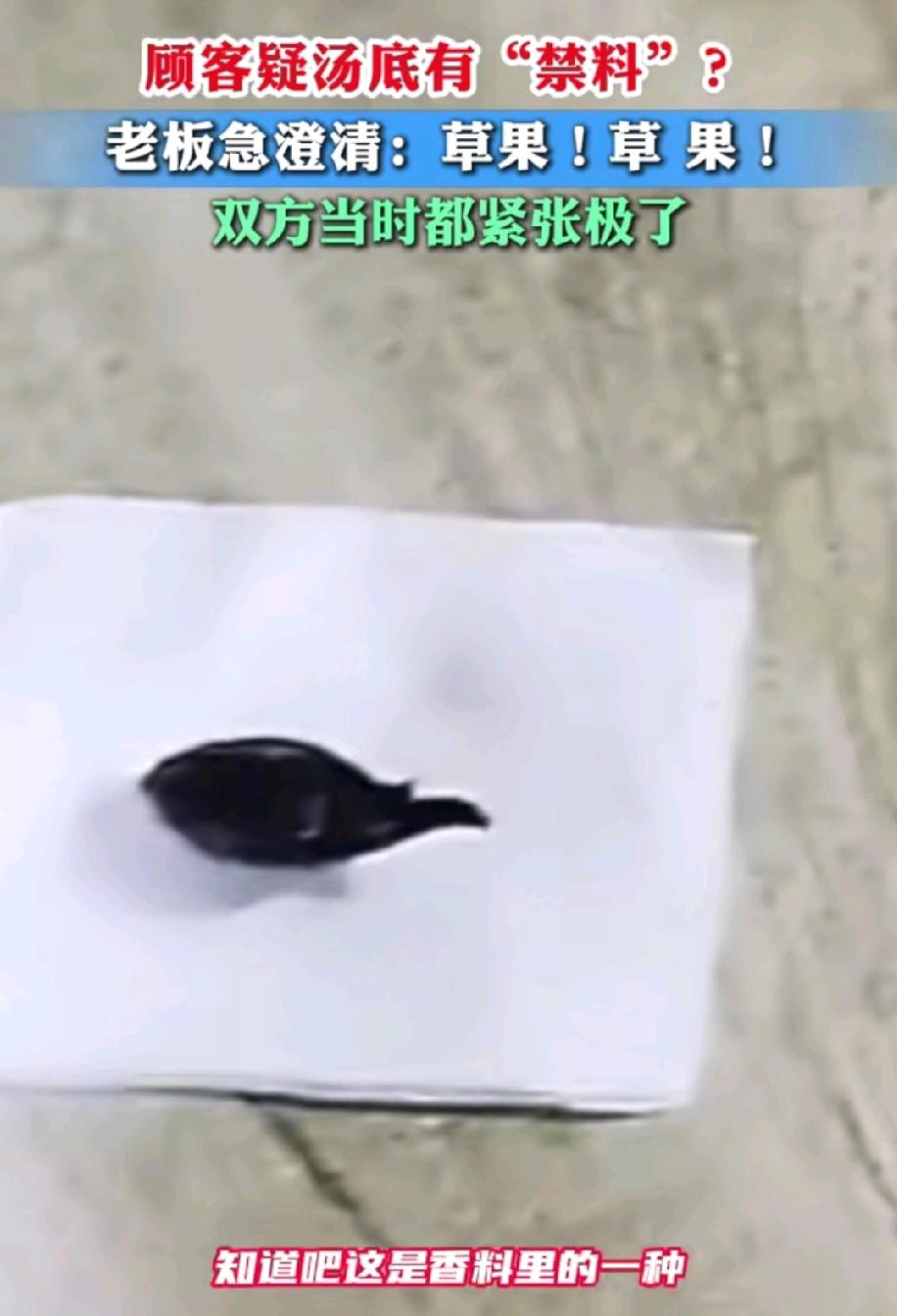 看来大家对毒的警惕心很高,但是常识还是的有,不然就闹笑话了! 天津,一顾客怀疑汤底有“禁料”,吃的吓一跳,卖的更是吓得快哆嗦了。顾客一挑出来,义正言辞说是国家禁止的东西。老板看到后就急着澄清,“这叫草果,知道吧,这是香料里的一种,饭可以乱吃但话不可能乱说哈。” 且不说两个长得压根就不像,就这十几块钱的板面,给你用这么大一颗那个,你觉得可能吗?老板不用赚钱了?净想美事! 不过现在的人很多都是五谷不分,没有常识,建议老板有空墙上贴张香料图片常识,省得顾客怀疑。