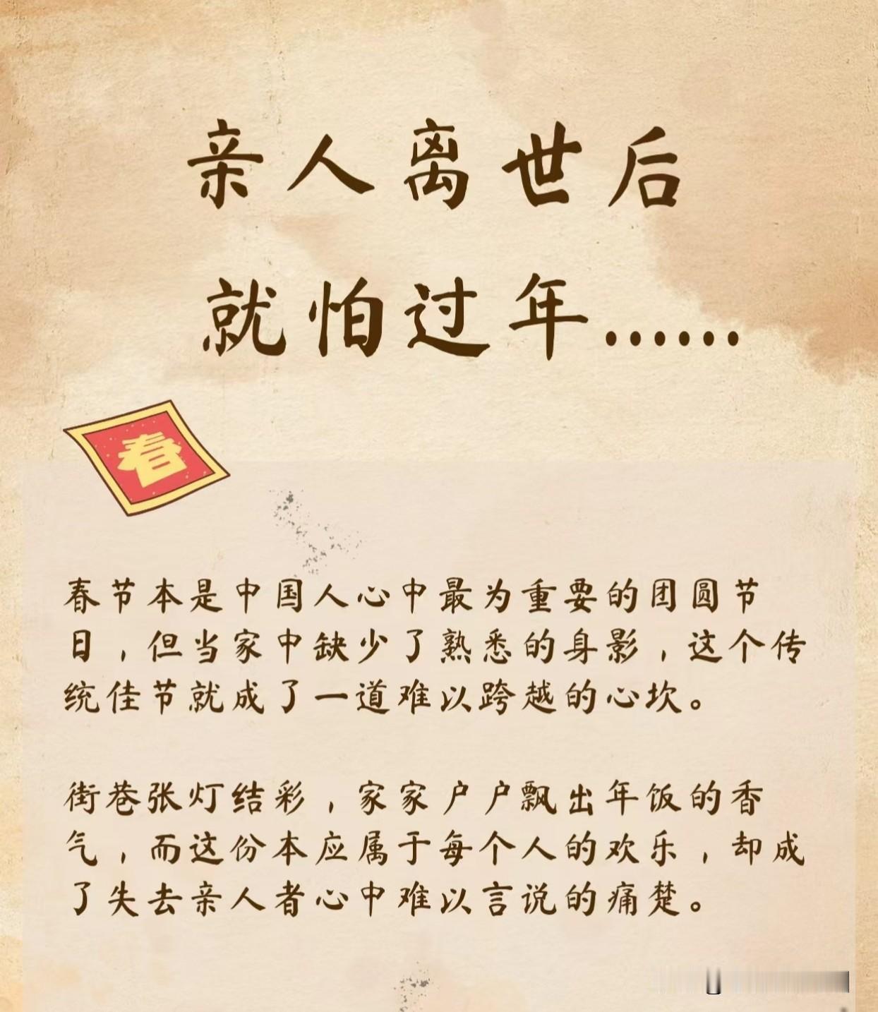 在除夕或初一,安静地擦拭父母的照片,做一道他们曾拿手的菜,去他们常散步的地方走走。这不是沉溺悲伤,而是完成一种庄重的纪念,告诉自己,我带着你们的印记,在好好生活。 翻开老相册,或写下关于他们的回忆。这能帮你清晰自己从何而来,更理解当下的自己。 伴侣孩子,你们构成了现在最核心的家庭。可以把父母曾有的传统,融入新家庭的仪式中,赋予节日新的传承意义。兄弟姐妹, 你们是彼此与父母最深刻的活记忆。一起回忆往事,分享各自的生活,能加固这份独有的手足纽带。 其他孤独的人, 比如社区里同样独居的老人、未能回家的年轻人,一次探望、一顿便饭,你的陪伴可能照亮两个人的节日。给重要的长辈、朋友打一个长长的、不敷衍的视频电话。告诉他们,虽然我爸妈不在了,但你们对我依然很重要。