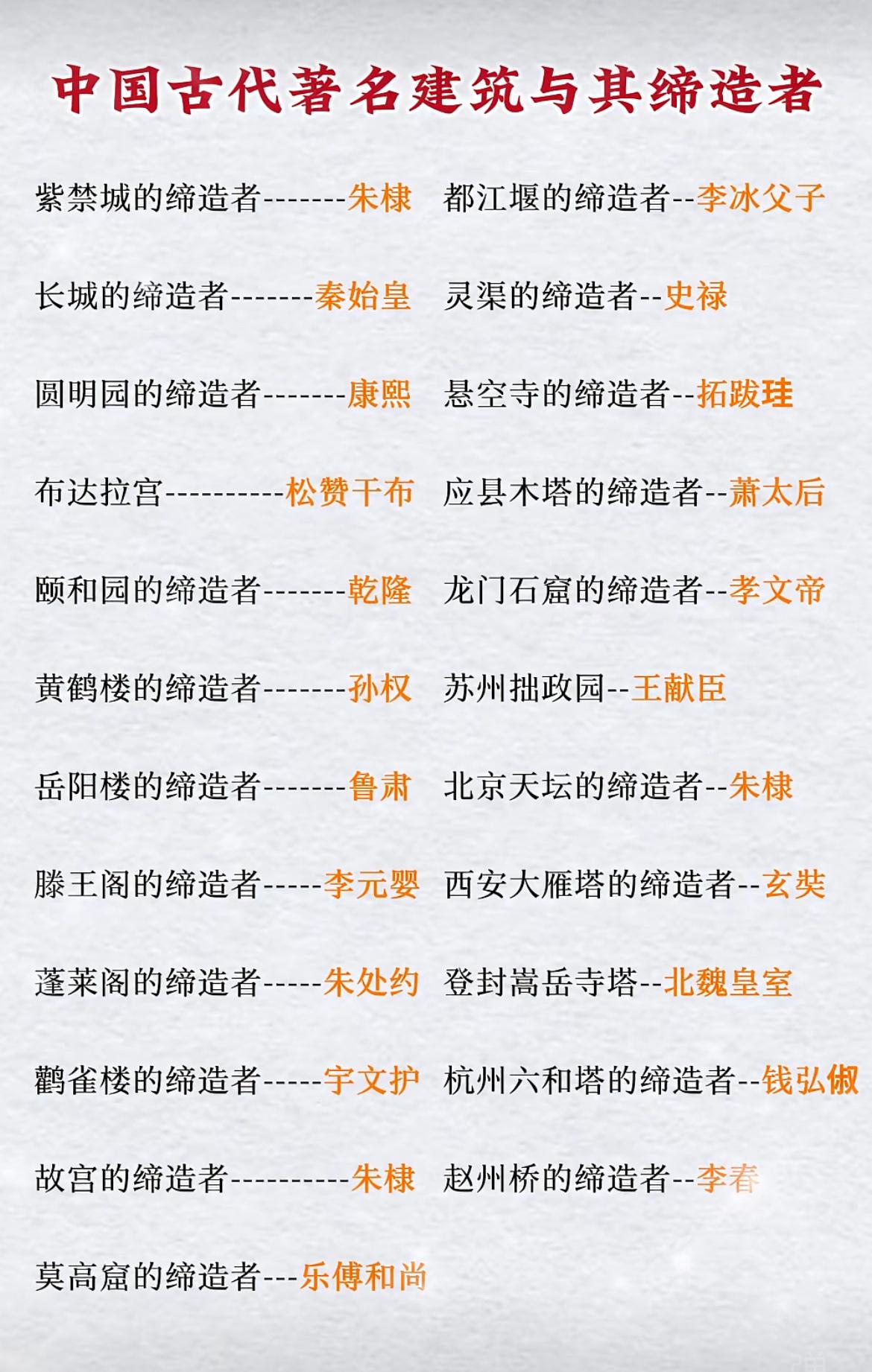 中国古代著名建筑与其缔造者。 去过其中一些地方,感觉敦煌莫高窟最让人震撼,地处偏僻,环境恶劣,并非当权者开辟,而是由一个和尚开辟,这份毅力不一般,而且历代有很多人锲而不舍的开凿兴建,给人感触很深。 古建筑