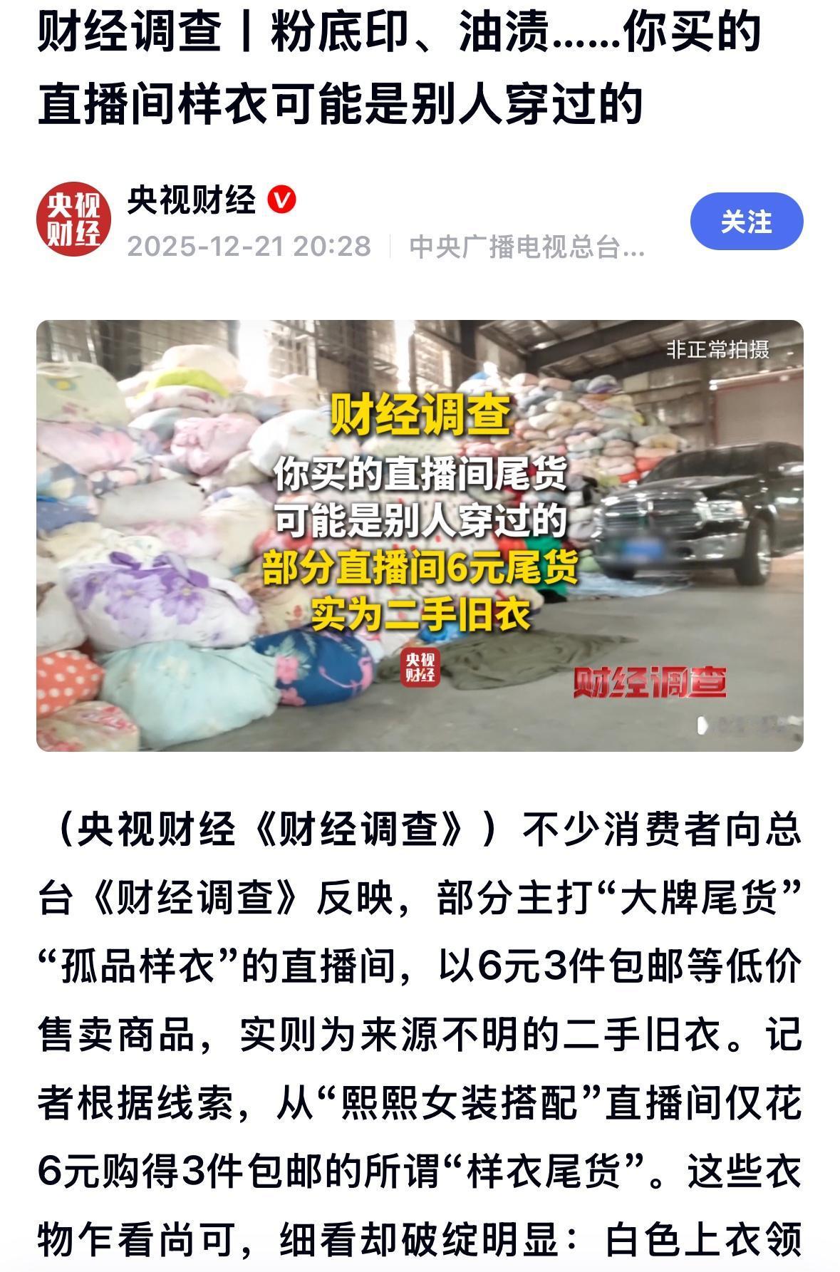 被直播间“6元3件大牌尾货”割韭菜了? 真相扎心了——你抢的“孤品样衣”,可能是别人捐进小区回收箱的旧衣服! 领口的黄渍、裙摆的油渍被美颜滤镜掩盖,商家一句“微脏微瑕”就搪塞过去,殊不知这些衣服根本没清洗消杀,甚至带着霉斑和化学药剂味就直接上架。 最恶心的是,回收箱打着“公益捐赠”的幌子,实则成了黑心商家的免费货源,我们的善意全成了他们牟取暴利的工具!购物别贪低价陷阱,健康和信任真的经不起这样消耗😤 西安二手市场 健康 超能健康团 全民购物节 分享今日的感悟