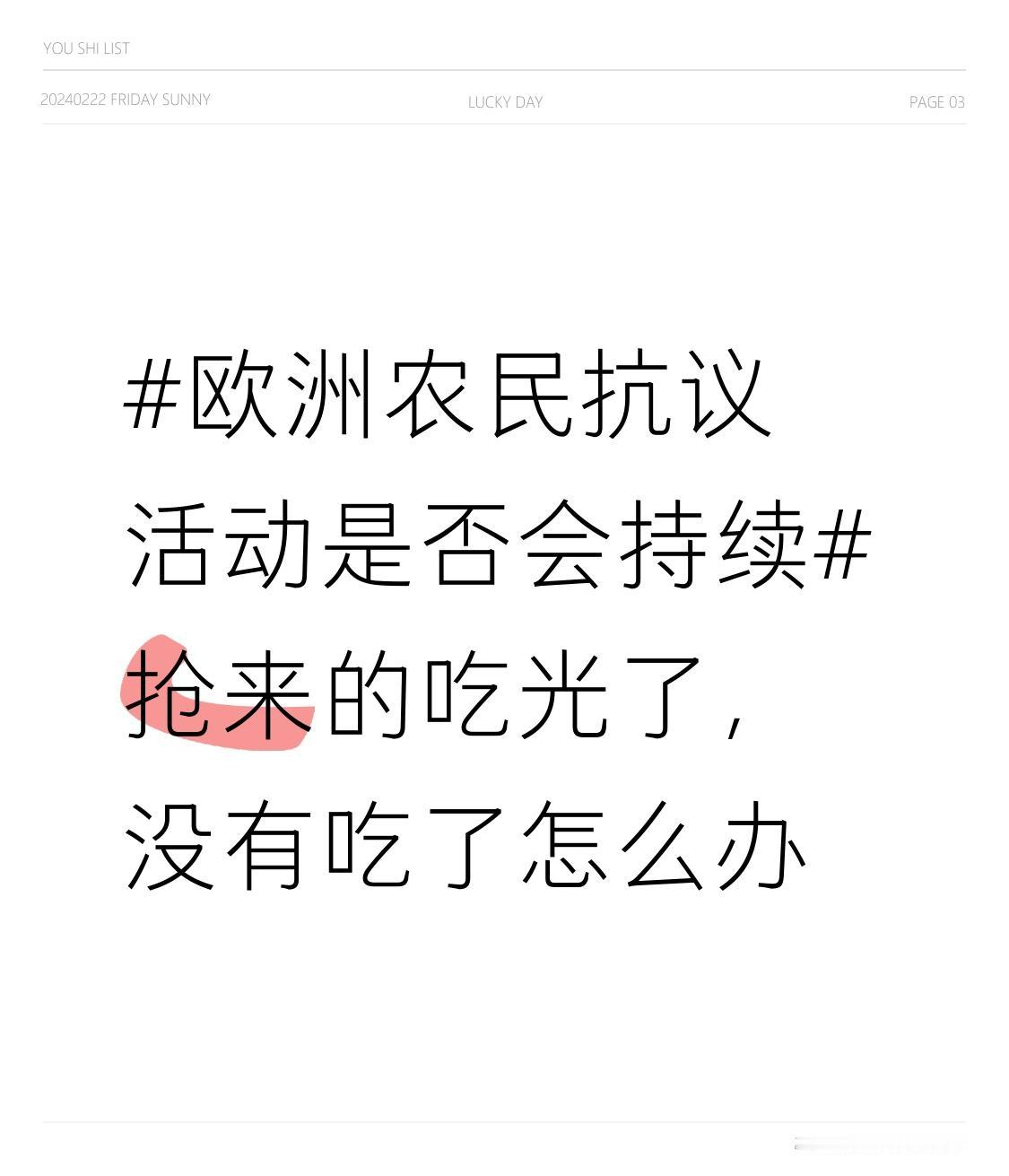 欧洲农民抗议活动大概率会持续。看看最近情况,意大利、西班牙、波兰、法国、希腊等多国农民都在抗议。意大利农民开着拖拉机车队在罗马环城高速行驶60多公里;西班牙数千家运输业个体户加入农民罢工,罢工已持续五天;法国农民封锁高速公路,希腊8000多名农民在宪法广场抗议一整晚。 他们不满政府削减农业补贴、欧盟绿色转型政策,以及欧盟对乌克兰的支持,这些让农业运输、生产成本上升,利润压缩,再加上乌克兰农产品涌入,农民更难了。“抢来的吃光了”,当利益受损问题不解决,农民为了生存,抗议肯定停不下来。