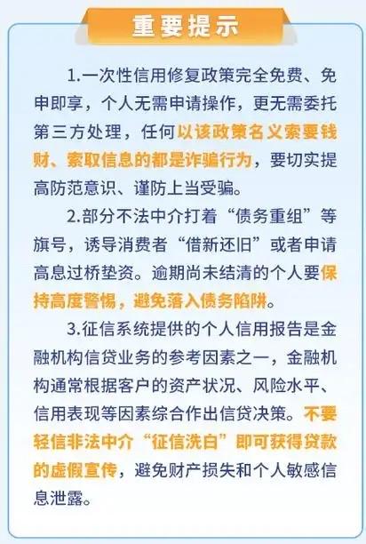 一次性信用修复来了!央行这波操作,戳中千万普通人的软肋 谁还没过被征信“卡脖子”的委屈时刻?忘了还信用卡几十块,征信黑了5年;疫情失业断供3个月,还清后买房贷款被拒;甚至银行系统故障漏提醒,却要自己扛下逾期污点——这些年,多少人因为一次“无心之失”,被信用记录捆住前行的脚步。 现在,转机真的来了!央行重磅官宣一次性信用修复政策,直接打破“征信污点硬熬5年”的旧规则,给千万普通人递上了“重启键”。划重点:2020年1月到2025年12月期间,单笔1万元内的逾期,只要在2026年3月底前还清,征信系统自动“抹去”记录,不用跑银行不用交材料,真正的“免申即享”! 这波政策最戳心的,是它读懂了普通人的无奈。不是所有人逾期都是恶意逃债:有人是疫情期间丢了工作,连糊口都难;有人是带娃忙到忘还款,发现时已逾期;还有人遭遇身份盗用,莫名背上逾期记录。这些非主观的失误,不该成为一辈子的“经济污点”。就像网友说的:“我打两份工还清了8千欠款,却因为征信贷不了款,开超市全靠借亲戚钱,现在终于能挺直腰杆申请资金了”。 当然,争议也随之而来。有人吐槽“1万额度太低”,欠3万还清却没资格修复;有人担心“会不会给老赖开后门”。但其实政策早已划清红线:恶意透支、多次催收不还的不在范围内,未结清欠款也无法修复,既守住了信用体系的公平,又给非恶意逾期者留了退路。 更贴心的是配套福利:2026年上半年能额外免费查2次征信,随时确认修复进度;遇到问题打4008108866就能咨询,全程零费用、零套路。提醒大家千万别信“代办信用修复”的诈骗,政策本身完全免费,别让骗子钻了空子。 说到底,这次信用修复不是“纵容失信”而是给知错就改的人一次机会。它让信用体系不再只有“冷冰冰的规则”,更多了“暖乎乎的人情味”。你有没有过被逾期记录困扰的经历?这次政策能不能帮到你?欢迎在评论区聊聊你的故事,也转给需要的朋友,一起卸下包袱轻装前行!