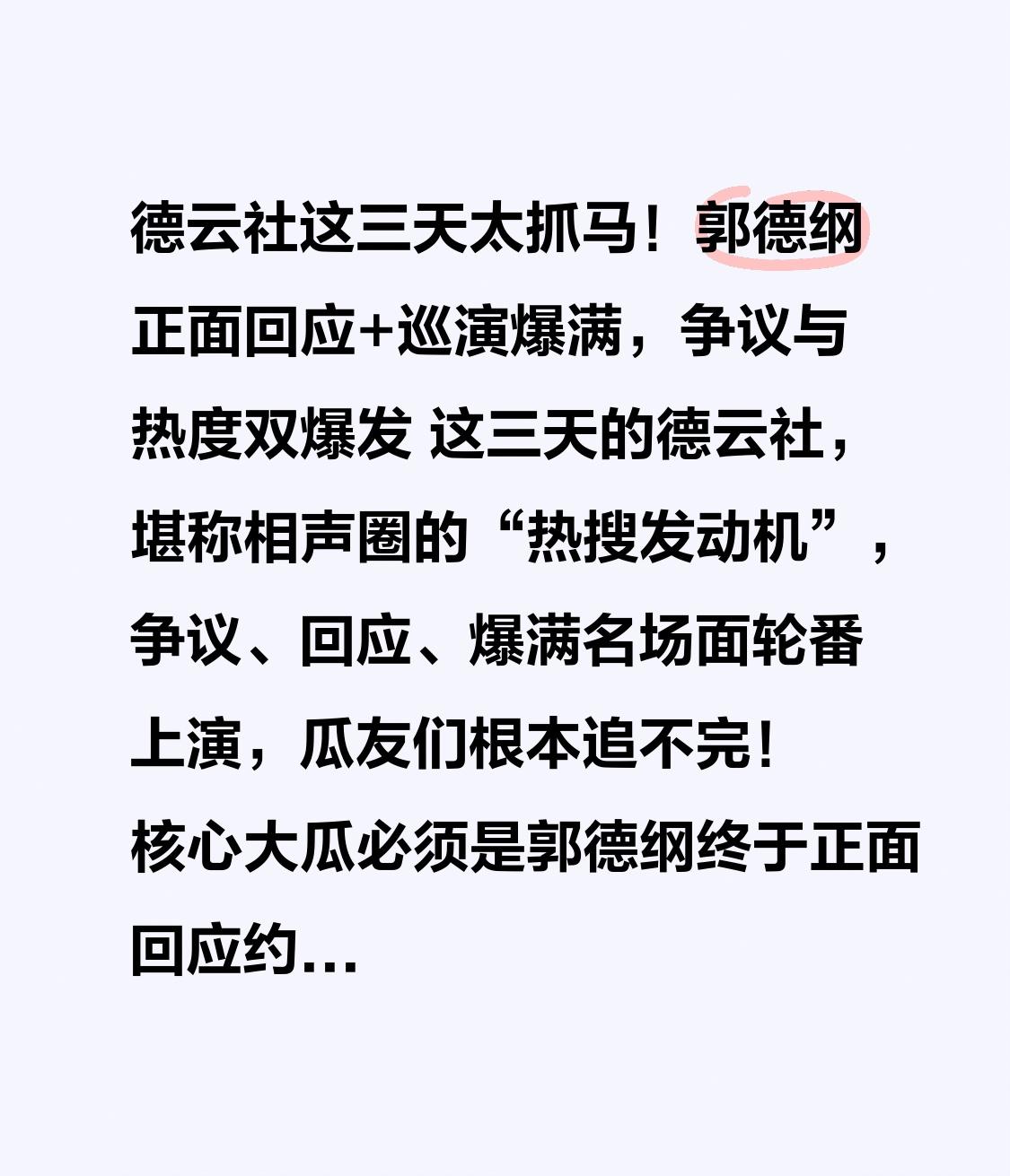 德云社这三天太抓马!郭德纲正面回应+巡演爆满,争议与热度双爆发 这三天的德云社,堪称相声圈的“热搜发动机”,争议、回应、爆满名场面轮番上演,瓜友们根本追不完! 核心大瓜必须是郭德纲终于正面回应约谈风波!12月21日公开活动上,老郭直接澄清“约谈是误会,只是正常投诉流程”,否认文旅局介入,还调侃事件是“坏蛋带着糊涂人打好人”,一句话平息不少猜测 。要知道此前《艺高人胆小》因谐音梗、讽刺桥段遭投诉,文旅部门批评教育后,相关视频全线下架、台本紧急整改,连同行都来凑热度,舆论吵得沸沸扬扬。 这边争议还没散,那边巡演热度又炸了!12月20日深圳场座无虚席,郭德纲亲自登台致谢,晒出的九宫格满是人气佐证;北京站跨年门票更是早被抢空,1800元VIP票最先售罄,苏州、南京等七城巡演也备受追捧。更绝的是纲丝节上岳云鹏的“救场名场面”,工作人员激光笔误伤观众引发混乱,他一句自黑“看看我行吗?就看一眼‘周深’”,瞬间逗笑全场化解危机,高情商圈粉无数。 从内容争议到正面回应,再到演出爆满,德云社这三天把“话题度”拉满。有人讨论相声讽刺的边界,有人为老郭澄清点赞,也有人坐等跨年巡演名场面。你站“艺术需要尺度”还是“讽刺是相声灵魂”?评论区聊聊~郭德纲