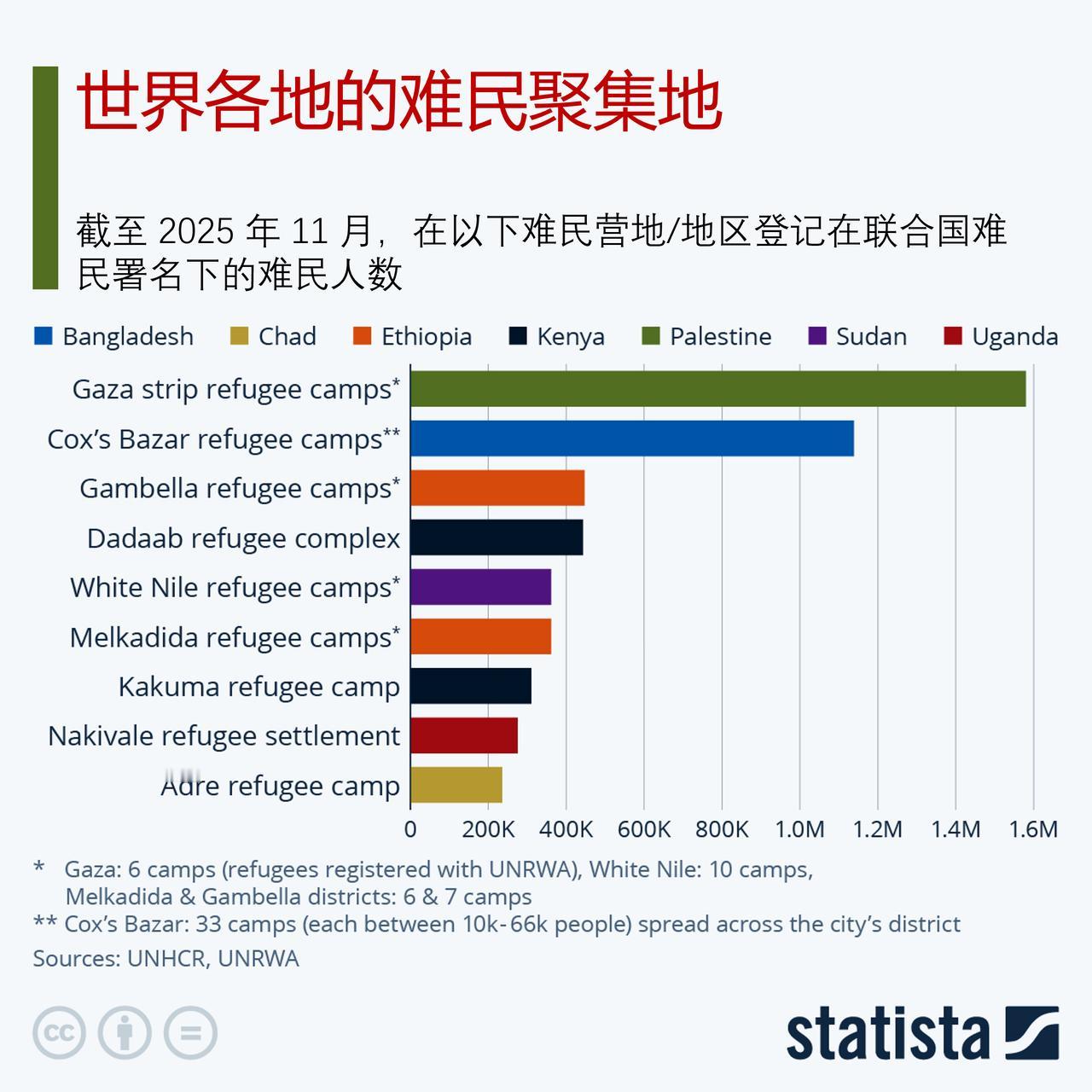 全球最大的难民聚集地分布在哪里? 每年 12 月 18 日是国际移民日,旨在纪念数以百万计被迫离开家园、为寻求安全或机会而背井离乡的人们。据联合国统计,目前全球有超过 1.22 亿人被迫流离失所,这一数字包括难民、寻求庇护者以及因冲突、迫害或气候灾难而在国内流离失所的人。今年,国内流离失所人数创下新高,人道主义需求不断上升,移民在途中死亡人数也创下有记录以来的最高水平,这凸显了安全、有序和人道的移民通道的紧迫性。 下面的图表基于联合国机构(联合国难民署和联合国近东巴勒斯坦难民救济和工程处)的数据,突出了世界上最大的难民聚集区:数以百万计的人在这些难民营或安置区寻求临时的安全庇护。巴勒斯坦加沙地带的难民营和孟加拉国考克斯巴扎尔市的难民营(主要收容逃离缅甸迫害的罗兴亚人)最为突出,每个难民营都居住着超过一百万的难民。这些难民营以及在非洲各地设立的众多此类难民营(分别位于埃塞俄比亚、肯尼亚、苏丹、乌干达和乍得)——收容着因地区冲突和干旱而逃离家园的人们——反映了当前全球面临的严峻挑战。十大难民营中登记的难民主要来自六个国家:巴勒斯坦、缅甸、苏丹、南苏丹、索马里和刚果民主共和国,这些地区正遭受战争、政治动荡和气候压力的困扰。