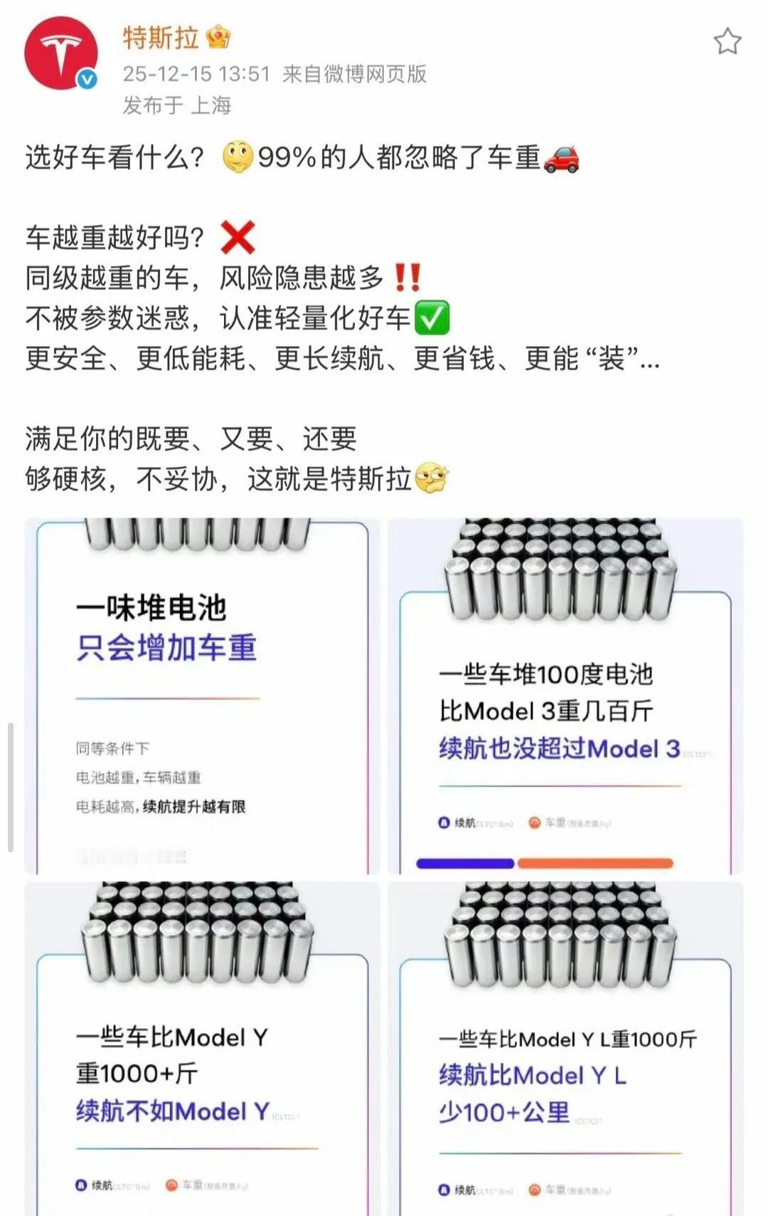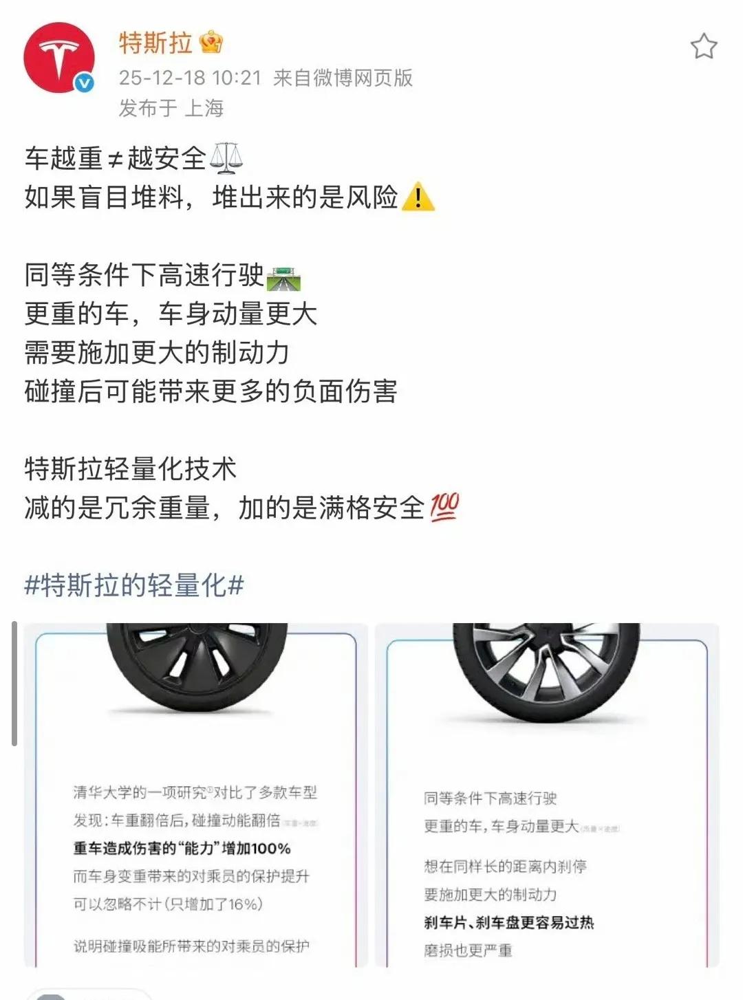 特斯拉这是在内涵谁?车当然不是越重越安全,这是一般人都知道的常识,不过很少见到特斯拉阴阳友商,这么明显的说有些车比modelY重了1000+斤,结果续航还不如modelY,有些车堆100度电池,比model3重几百斤,续航也没超过model3,这是在diss哪个竞品?大家怎么看?