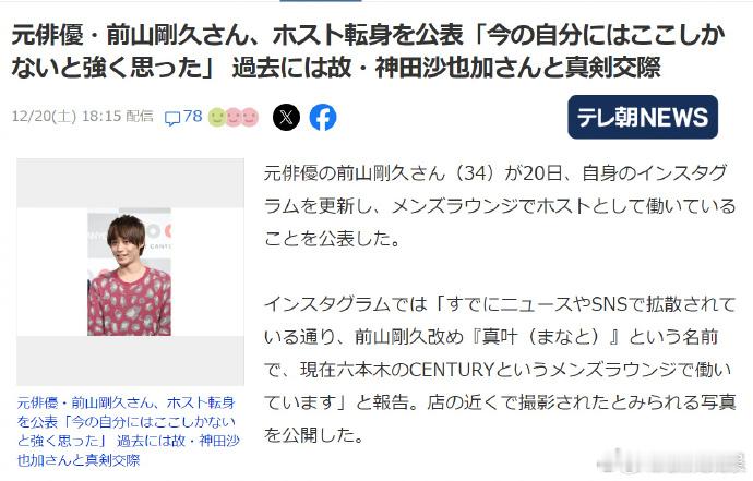 神田沙也加生前男友转行做牛郎前山刚久转行做牛郎 据日媒,神田沙也加生前男友前山刚久宣布转行做牛郎。他透露暂停演艺活动后尝试过留学、舞台剧复出、经商等事情,但都未成功,所以选择了这一职业。据悉,神田沙也加在2021年去世,疑似因男友前山刚久出轨选择自杀。