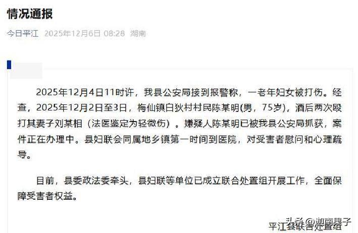 湖南平江县梅仙镇白狄村这事儿闹得人心酸,一个75岁的老头陈某明,12月2号到3号这两天,喝多了酒就冲着老伴刘某相发火,动手打了两次。 结果呢,刘某相脸上青一块紫一块,眼睛肿得睁不开,耳朵边上还留了道大疤,法医查了是轻伤。4号有人报了警,警察赶紧抓人,现在案子正走程序。 这对老两口,日子本该安稳点,可惜儿子在外头打零工,每个月就挣那么几千块养家,女儿嫁人了身子还弱,家里就俩老人守着。 村里人私下嘀咕,陈某明平时就好这一口,喝高了脾气上来,过去也没少干这缺德事儿,偏偏村小人少,谁也没留意。 家暴这玩意儿藏得深,尤其上了年纪的夫妻,儿女飞了,邻里不爱管,酿成大祸才后悔。 数据显示,全国上亿家庭里头,暴力问题搅和着三成左右,老年人受害更惨,拐卖案子降了九成多,可隐形伤还得靠社区多盯着。酒劲儿上头不是挡箭牌,零容忍才对头,早点拉一把,就能少点眼泪。 平江县这回动作快,政法委领头,妇联公安一块儿上,第一时间给受害人送温暖,心理疏导也跟上,联合小组护着权益不松口。 这样的机制,得在全国推开,让暴力没地儿藏。家和万事兴,动拳头解决不了啥,只会让后悔来得更猛。得从根儿上抓,教育加干预,帮老人多建个说事儿的地方,别让小火苗烧成大祸。 平江事件 平江家暴