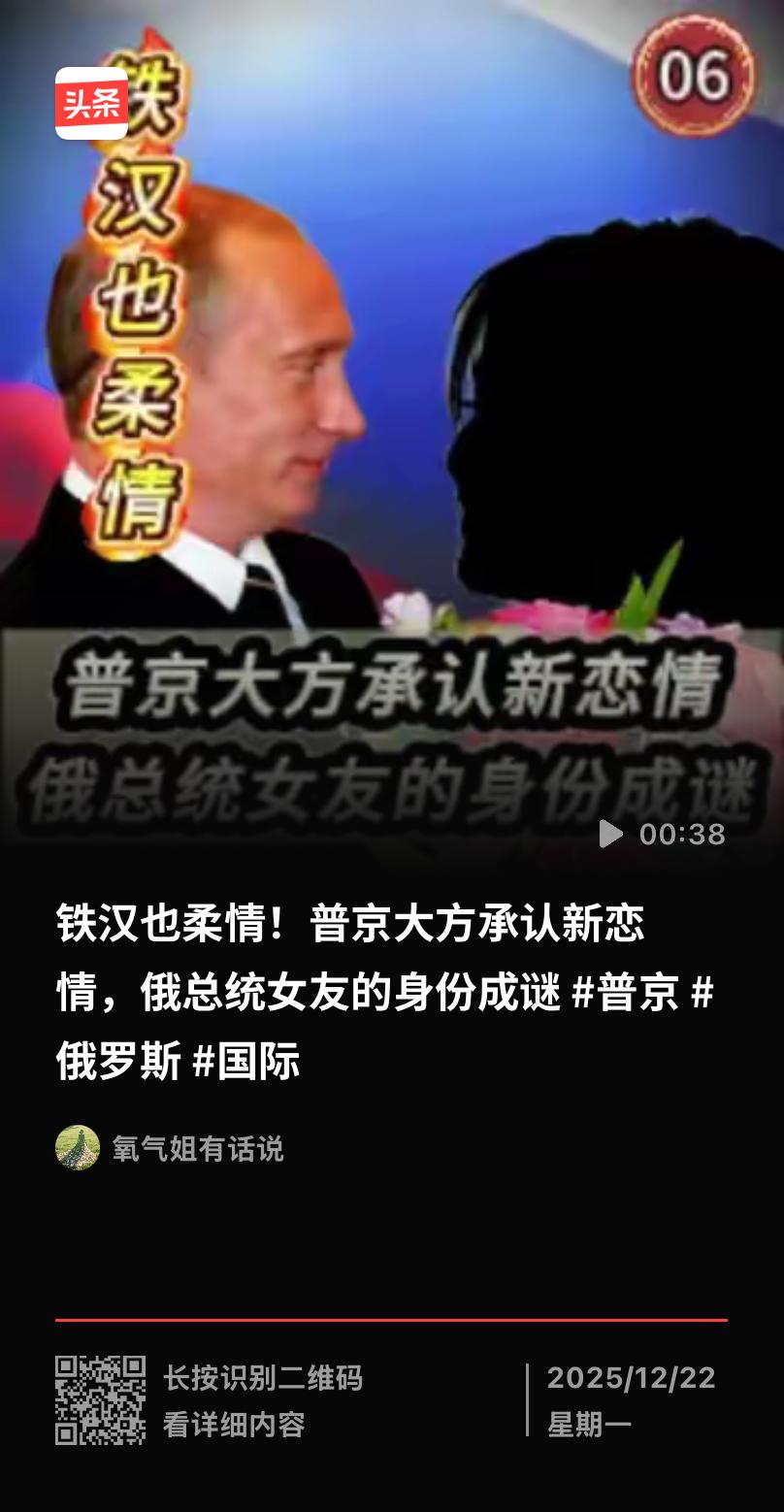 炸锅了!73岁普京12年首度松口,承认正在恋爱,硬汉突然温柔藏啥门道? 2025年12月19日的莫斯科年度记者会,硬是把国际政治发布会开成了“情感官宣现场”!一名女记者胆子超大,敢直接问普京的私人感情,没想到这位以铁腕著称的73岁大佬,没像过去12年那样打太极,干脆利落点头说“是的”,承认自己正恋爱。 要知道,自2013年和结发30年的前妻柳德米拉离婚后,普京对私生活那叫一个严防死守,记者问起要么说“该尊重隐私”,要么干脆不接话,去年也就敷衍一句“一切正常”。这次不仅坦然认爱,还打趣要“留块蛋糕”,松弛感直接拉满,跟平时的强硬形象反差大得像换了个人。 不过普京也贼精明,只认了恋爱这事儿,对象是谁、啥来头半个字没漏,既满足了大家的好奇心,又守住了底线。克里姆林宫随后也出来打圆场,呼吁媒体别过度窥探。 有人说这是普京在复杂局势下拉近距离,让民众觉得他也是有七情六欲的普通人;也有人说这是他对国家局势有底气的表现。73岁还能收获爱情,这事儿本身就足够颠覆认知——毕竟在大家印象里,普京是那个在俄乌战场上稳握战略主动权、怼西方不手软的硬汉,是把俄罗斯GDP拉回增长、国际储备冲到7415亿美元的掌舵人,怎么看都该是“眼里只有国家大事”的铁面形象。 可细想就懂,这哪是一时兴起的温情流露?普京从来不是会被情绪左右的人。离婚12年里,关于他和奥运冠军卡巴耶娃的传闻就没断过,西方媒体炒得沸沸扬扬,甚至把对方列入制裁名单,说她是“核心圈层的人”。现在主动松口,说白了就是把主动权攥在自己手里,让那些捕风捉影的八卦失去炒作空间。 更关键的是,当下俄罗斯正处在特殊阶段,硬汉形象固然能凝聚人心,但偶尔展露柔情,更能让民众觉得“领袖和我们一样有血有肉”。73岁还能坦然拥抱爱情,本身就是一种“状态在线”的信号,悄悄打消了外界对他健康和精力的疑虑。 这波操作堪称教科书级别的形象管理,既没丢大国领袖的体面,又多了几分烟火气。你觉得普京这波“官宣”是纯粹的爱情使然,还是藏着更深的政治考量?来评论区聊聊你的看法!