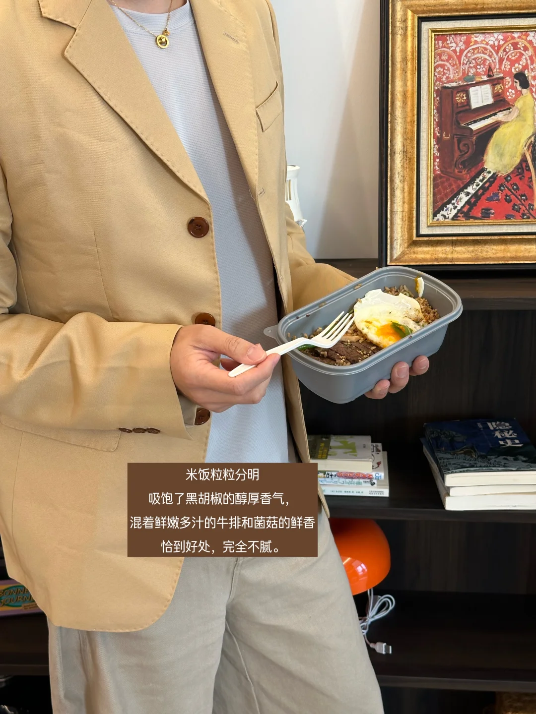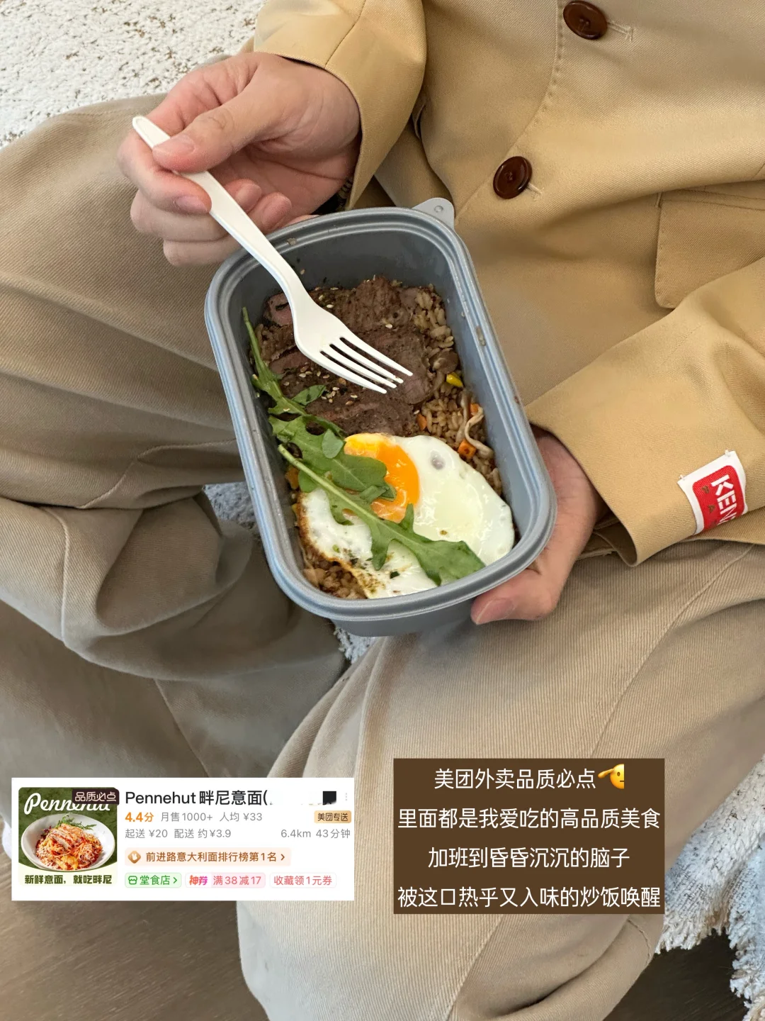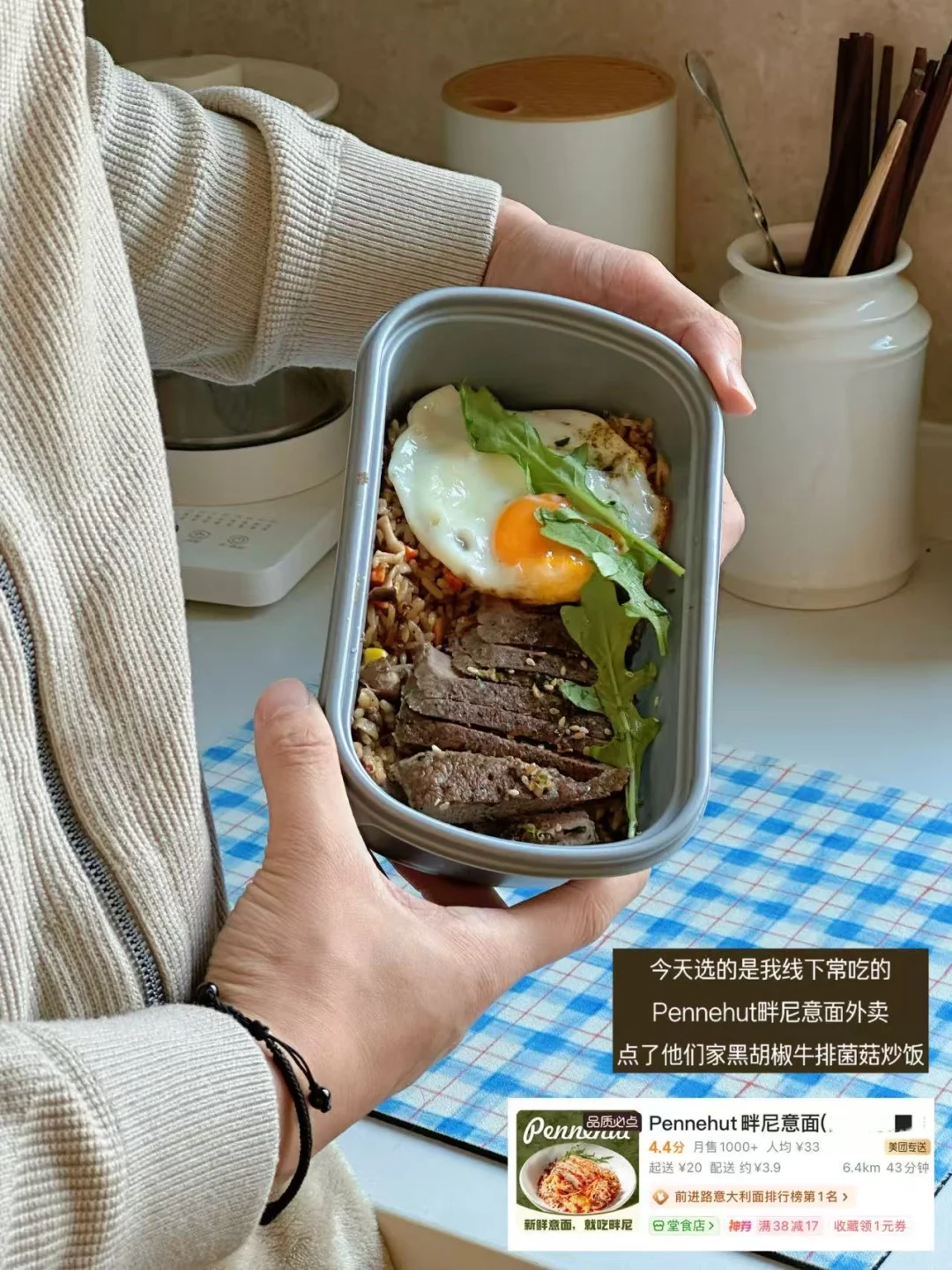 今天选的是我线下常吃的Pennehut畔尼意面,点了他们家的黑胡椒牛排菌菇炒饭。加班到昏昏沉沉的脑子,被这口热乎又入味的炒饭唤醒,连带着疲惫感都消散了大半,吃完瞬间觉得又能满血复活继续战斗了🍜