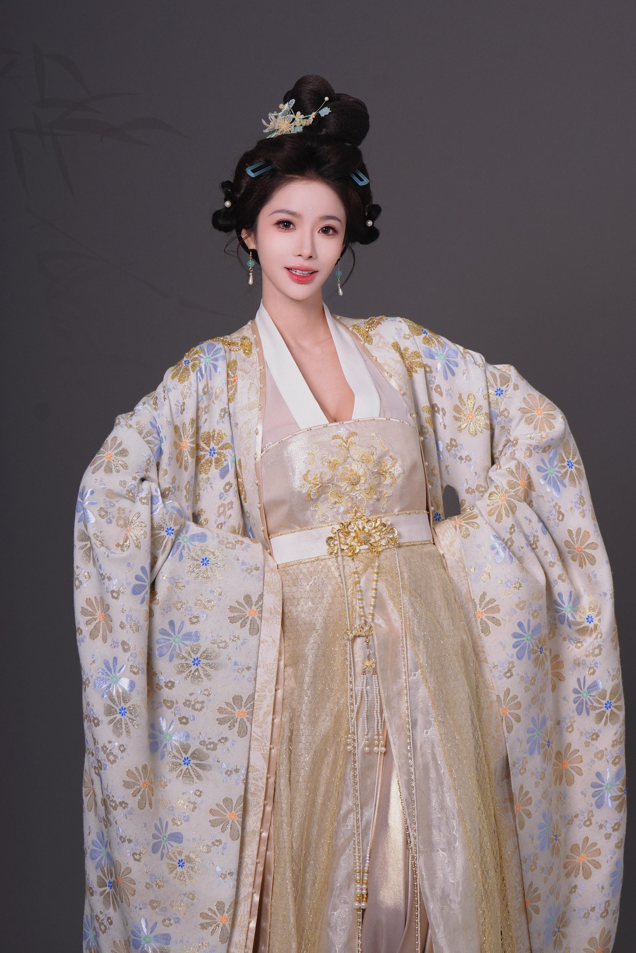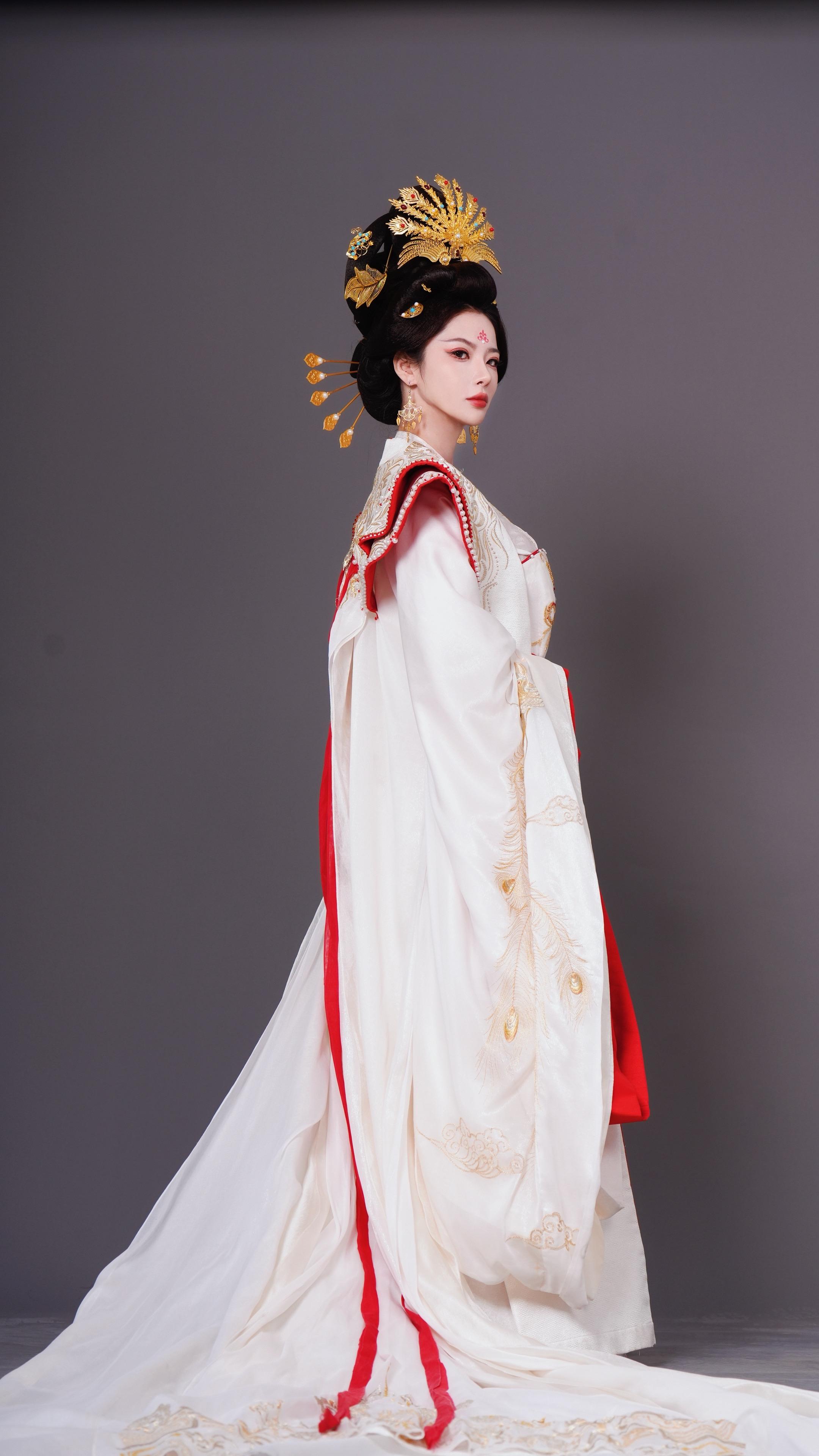 雪山之巅映红霞,汉服佳人笑如花。白衣胜雪舞翩跹,山川美景共她华。发丝随风轻轻