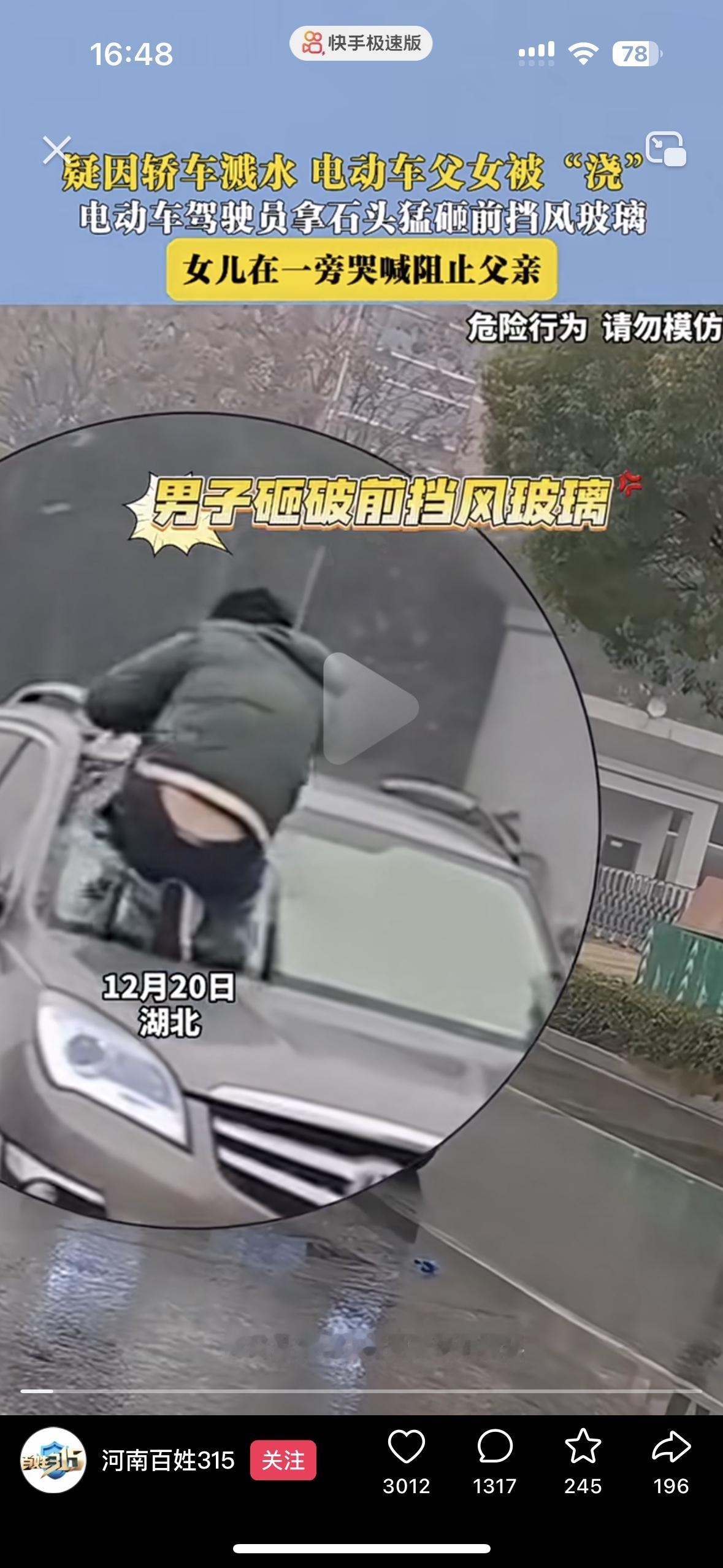 冲动就是魔鬼!女儿救了他一命,否则一脚油门,一切结束。司机还是太仁慈,男子和女儿骑着电动车被旁边经过的车辆溅了一身水,男子爬上对方的车前方,敲打对方的玻璃!女儿在一旁大哭劝阻。浇湿了大不了换新衣服,砸对方的玻璃就违法了 司机师傅溅一身水虽然不道德,但这样的做法,无异于给对方递刀子捅自己!明明有理的事都变得无理了