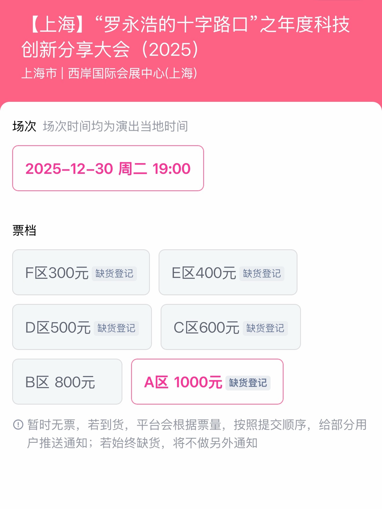 罗永浩的票基本卖完了、还剩B区、可能也快售罄了
