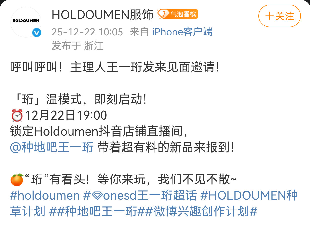 十个勤天王一珩今天晚上19:00,王多多空降HOLDOUMEN直播间
