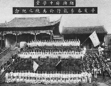 1911年春的禹陵前,绍兴府中学堂的师生攒聚在石阶上,凝成这帧辛亥春季旅行的纪念照。 学生们身着统一的浅色学堂制服,队列齐整里漾着少年人的朝气,几面旗帜斜斜扬起,给庄重的纪念场景添了几分集体出行的鲜活。画面左上角,身着黑衣的鲁迅立在人群边缘,彼时他是这所学堂的生物学教员兼监学。