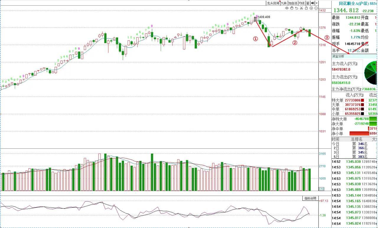 现在是高抛点,不是进攻点,耐心等待新一轮调整的低点。 周末的时候说到,美股走强就按红色路径走。周初冲高见反弹高点。 目前走势依然是③阶段的调整,这个调整从3936算起。 就看后续能不能破新高3936,不能破就按原预判, 后续上冲了3936,那③的低点就少跌一点,但后续区间横盘会久一点。 就是所谓的用区间震荡代替下跌,这是强势表现,波段机会不大,但有了更多的小机会。 今日整体是小普涨,上午一度3600多家上涨,下午指数没跌反涨,但个股多跌了500多只。 最终近2300家下跌。 上周五4400多家上涨,科技股却逆势下跌,今日科技股反而强势,那么上周五上涨的多半今日都是绿的,所以指数4连阳,个股走势大部分却很艰难。 行情还是轮动太快。很难有持续性的赚钱效应。 目前就是根据走势寻找下一波段的主线,目前已经开始明朗了许多,静待看调整的方式是如何进行的。