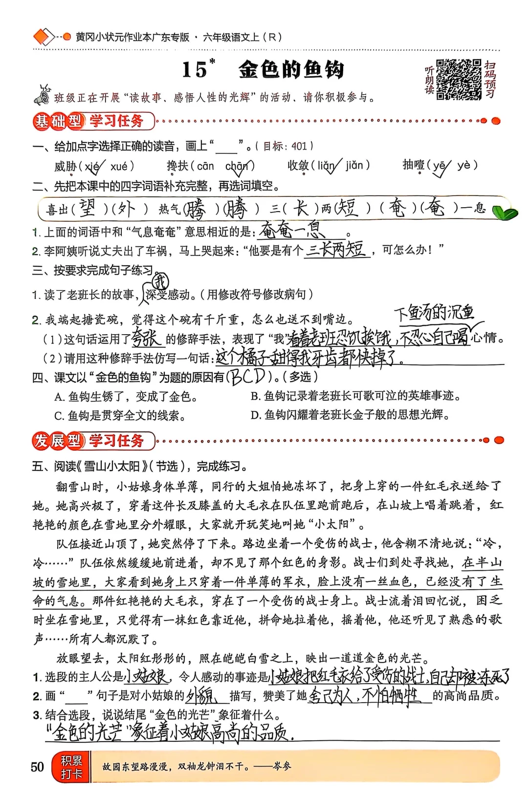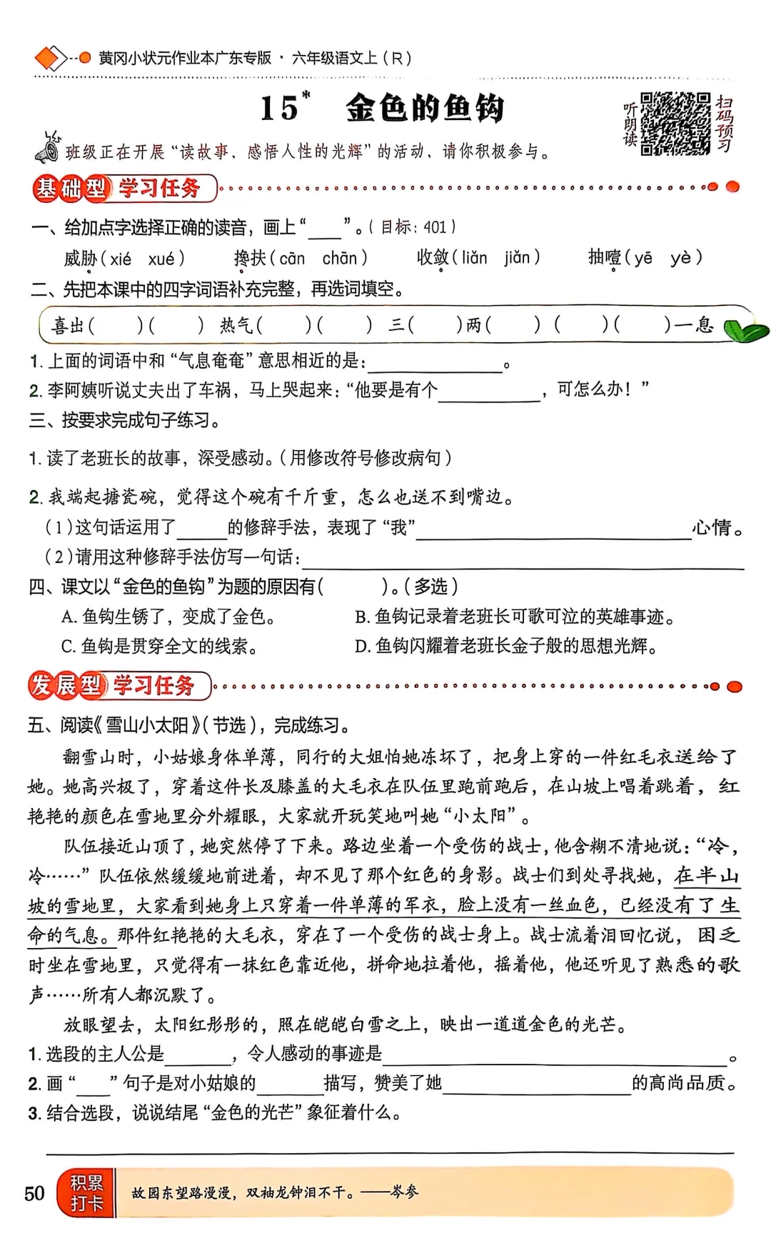 六上语文第15课《金色的鱼钩》课堂笔记及习题