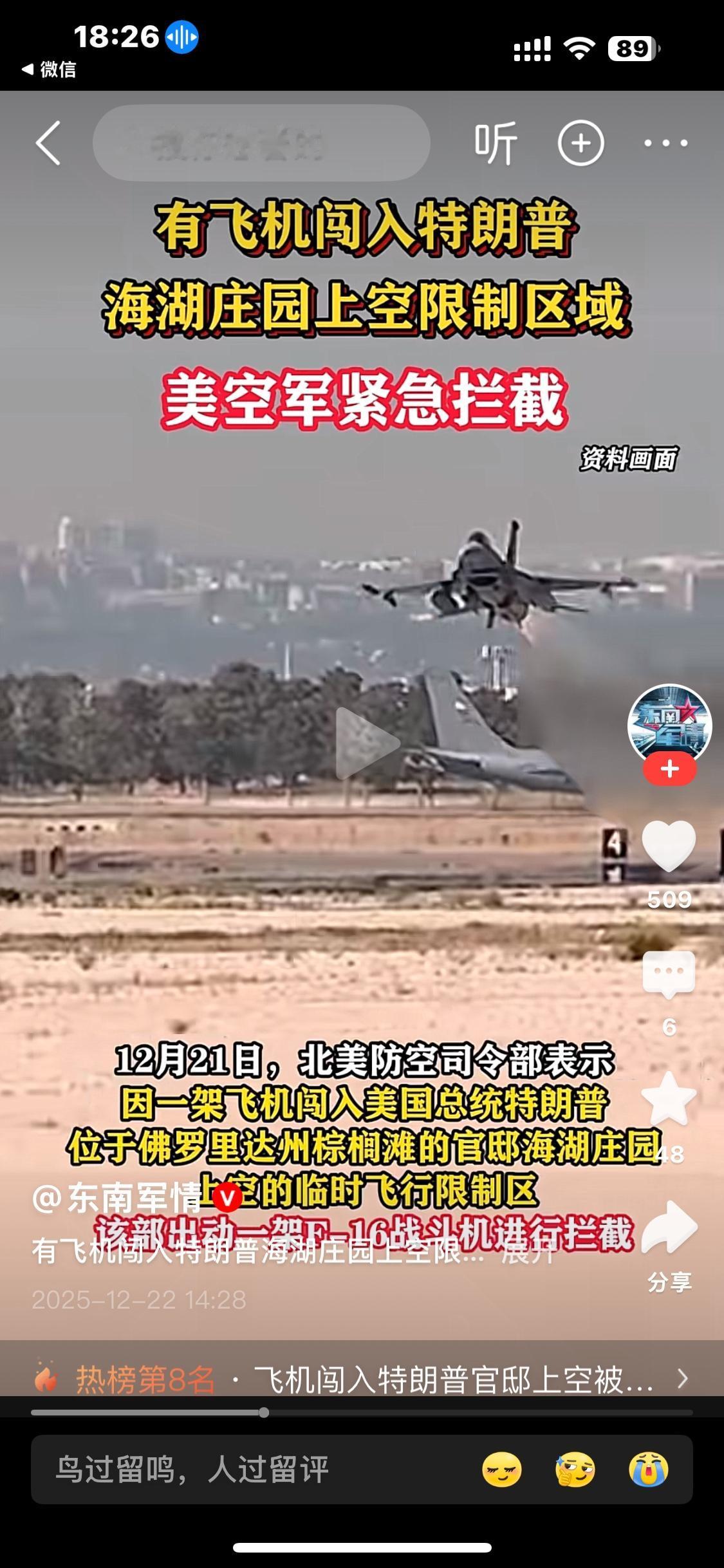 海湖庄园上空突发拦截!F16战机紧急升空 民用飞机闯特朗普专属禁飞区 当地时间21日,北美防空司令部在社交平台X扔下重磅消息:一架民用飞机擅自闯入佛罗里达州棕榈滩海湖庄园上空的临时飞行限制区,美军F16战机紧急升空处置,最终将这架飞机安全护送离开限制空域。要知道,海湖庄园可不是普通豪宅,作为特朗普口中“宇宙的中心”,这里既是六星级私人俱乐部,更是曾举办过多场国际会晤的“冬季白宫”,安保级别堪称顶级。 只要特朗普在场,庄园周边就会设立半径55.56公里的临时禁飞区,覆盖整个棕榈滩核心区域,这道空中防线专门防范低空飞行物带来的安全风险。此次F16战机快速响应,完全是标准处置流程,既完成了对违规飞机的识别拦截,更用实际行动形成强力震慑,让外界看到顶级安保的硬实力。 更让人意外的是,这并非孤例!自特朗普就职以来,类似闯入事件已发生40多起,北美防空司令部多次出动F16战机,有时还会发射照明弹或采取特殊动作提醒违规飞行员。但此次声明中,并未透露涉事飞机的具体型号、飞行员身份以及是否知晓禁飞规定等关键细节,这些悬念让网友议论纷纷。 很多人第一反应觉得“这是安保漏洞”,但换个角度想,能在第一时间侦测到异常目标并迅速出动战机拦截,恰恰证明防空体系运转高效。真正该深思的是,40多起事件频繁发生,到底是人性中的侥幸心理在作祟?还是部分飞行员根本没把空域规则当回事? 要知道,海湖庄园的空域管控堪称铁律,作为曾接待多国政要的重要场所,这里的安保标准早已细化到每一个环节。擅自闯入的飞行员绝非“小事一桩”,可能面临严厉法律制裁,无论是私人飞行还是通航公司,起飞前核对空域限制信息都是不可逾越的底线。 这起事件更像一面镜子,照见了规则意识的重要性。在安全面前,没有“差不多”“没关系”,每一次心存侥幸都可能酿成大错。顶级安保能拦截违规飞机,却拦不住少数人对规则的漠视。 40多起类似事件,到底是飞行员疏忽大意,还是空域公告仍有优化空间?特朗普的“空中防线”再严密,为何仍挡不住频繁闯入?这样的空中插曲还会继续上演吗?欢迎在评论区留下你的看法,一起聊聊规则与安全那些事!