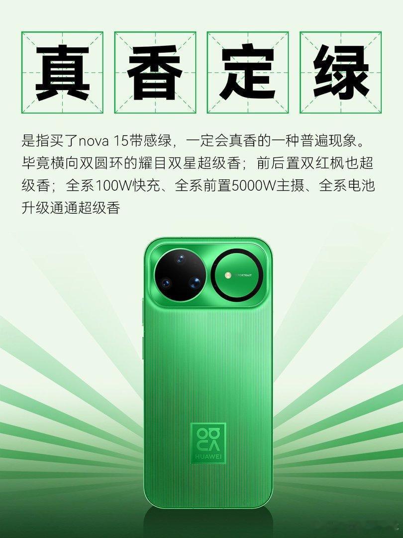 nova15搭载麒麟9系旗舰芯片我最看重的是“用起来不糟心”。 nova 15 Ultra/Pro麒麟9010S把性能底子抬上去,HarmonyOS 6又把流畅和互联拉满:圈选识图、智感支付/扫码、碰一碰、亲情防诈都挺实在。拍照有行业唯一前后双红枫,色彩还原准确度提升120%,再加全系前置5000W主摄,随手拍更容易好看。续航还有全系电池升级+全系100W快充,日常更踏实。我更愿意把它叫“省心型旗舰感”。超级nova超级香!nova15这把高端局