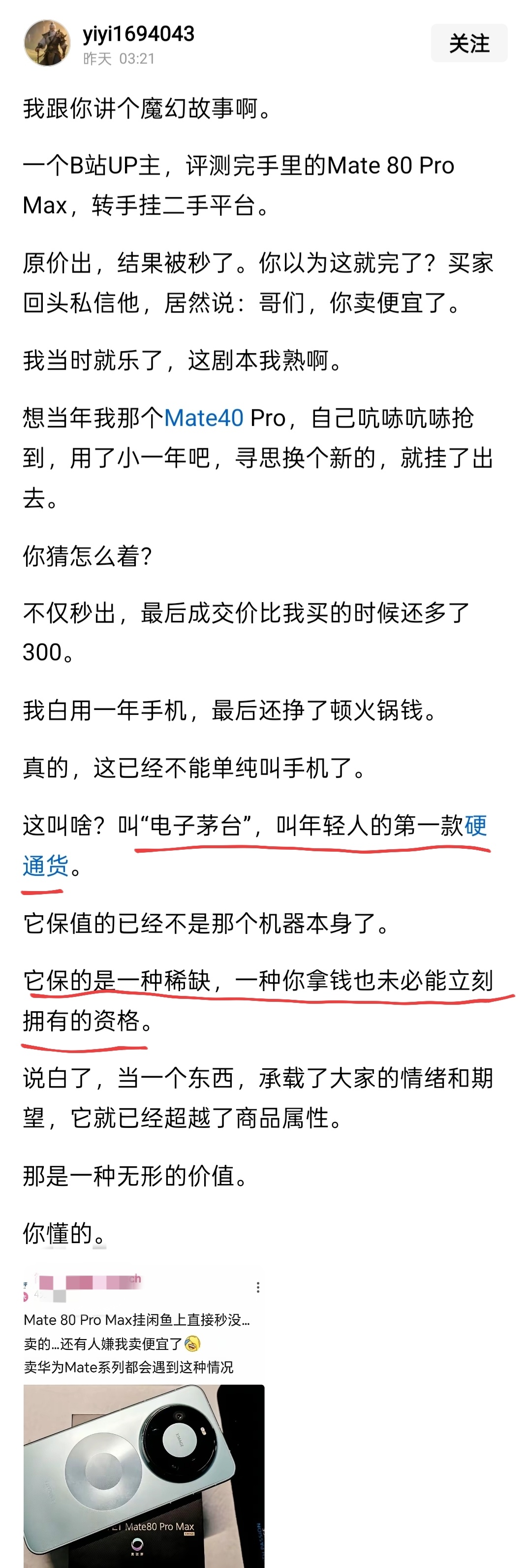 网友分享的两个魔幻故事,二手华为手机可以原价出,甚至用了一年还能加价卖,称赞这是电子茅台