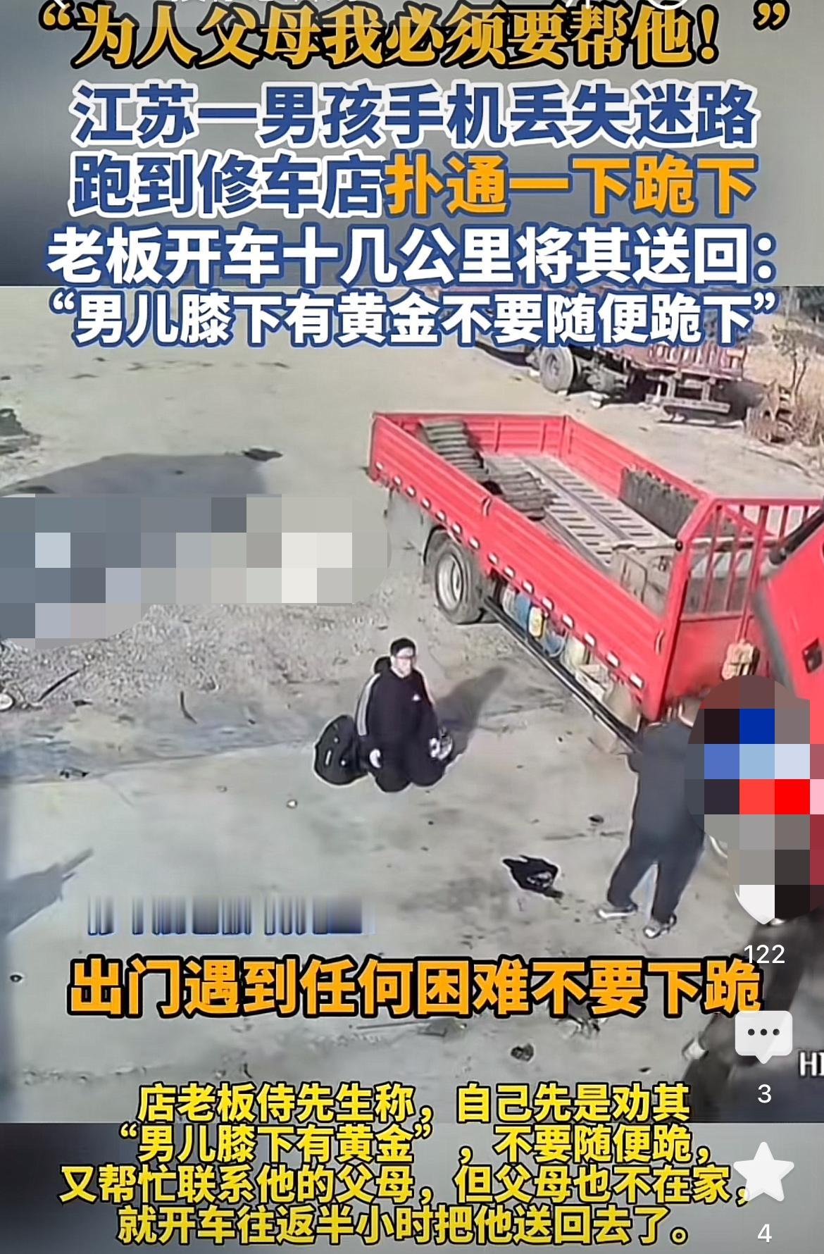 孩子扑通一声就跪下了!这是在江苏修车店里发生的真实一幕。一个男孩慌慌张张跑进来,看样子是迷路了,找不着家,急得情绪直接崩溃,对着修车店老板就跪下了求助。那场面,任谁看了心里都得一紧。 修车店老板赶紧上前,没半点犹豫,先把孩子扶起来稳住情绪。孩子肯定是吓坏了,手机丢了,方向也懵了,要不是真没辙了,哪能这样。老板耐心问了情况,知道孩子家离这儿可不近,十几公里路呢。你说这人生地不熟的,让孩子自己怎么回去? 老板接下来的决定,让人直竖大拇指。他放下手里的活儿,直接说开车送孩子回家。十几公里,不是什么顺道路过,是专程跑这一趟。一路上开得稳稳当当,心里就惦记着把孩子平安送到家。到了地方,孩子家人那个感激啊,道谢的话说个不停。老板回应得特朴实,他说,自己也是为人父母的人,看见孩子这样,这个忙必须帮。 大伙儿觉得,这种温暖的小事是不是特别治愈?换成是您碰到这种事儿,您会不会伸出援手?欢迎来评论区聊聊你的感受。 [免责声明]文章的时间、过程、图片均来自于网络,文章旨在传播正能量,均无低俗等不良引导,请观众理性看待本事件,切勿留下主观臆断的恶意评论,互联网不是法外之地。本文如若真实性存在争议、事件版权或图片侵权问题,请及时联系作者,我们将予以删除。