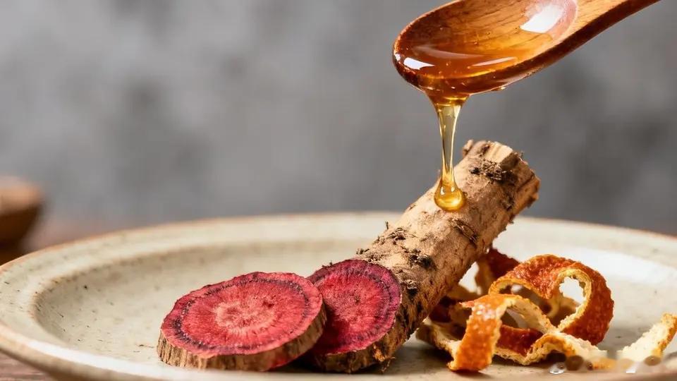 滋补养生食疗:甘草芍药蜜饮甘草芍药蜜饮[配料]芍药、甘草各10克,陈皮6克,蜂蜜60克。[制用法]将芍药、甘草、陈皮下入锅中,加水煎汤,去渣后加入蜂蜜调匀即。[功效]养血益胃,适用于胃及十二指肠溃疡患者的辅助食疗。每天分2次饮用。 淄博·广成中医