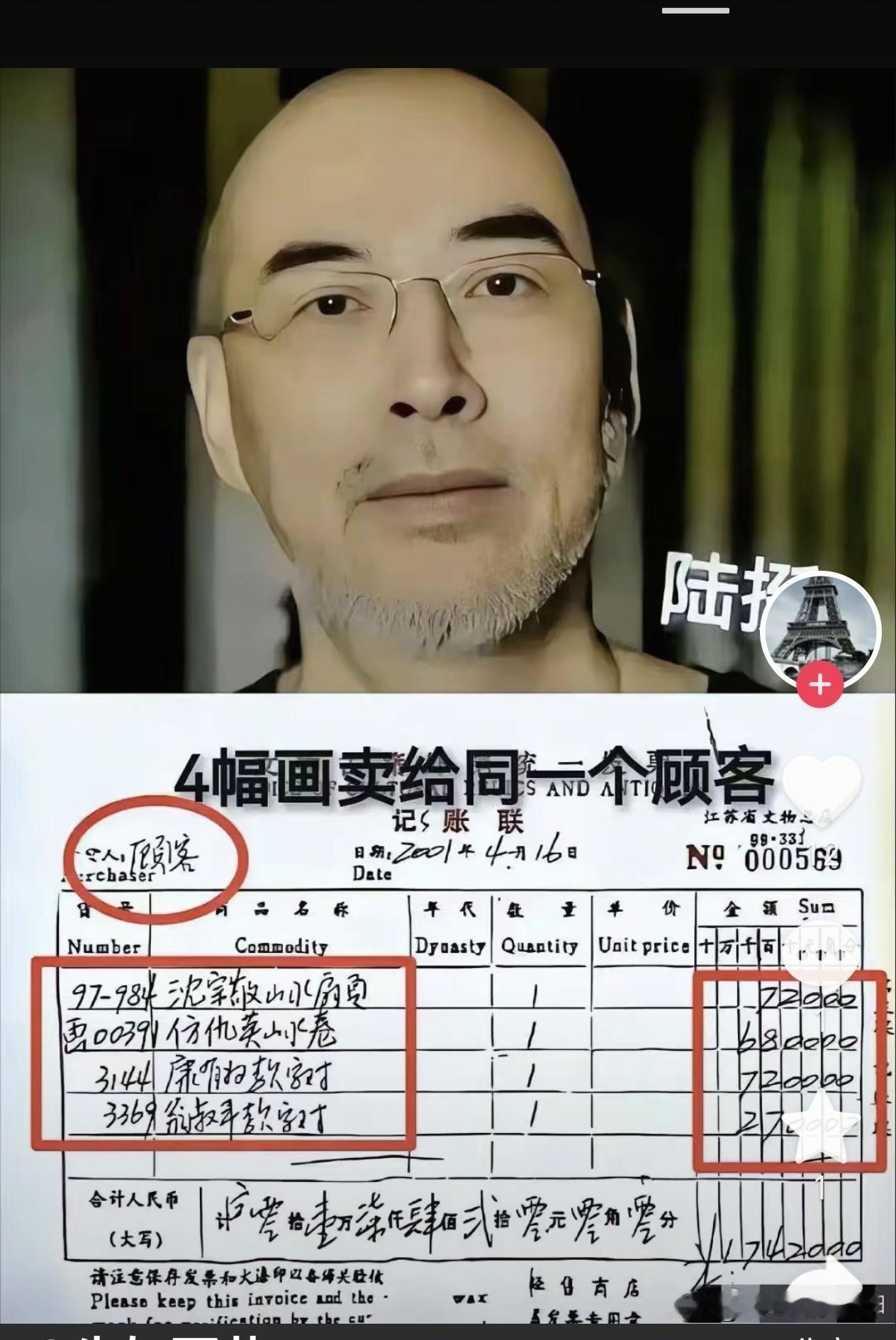 第一张图里是艺兰斋创始人陆挺,第二张是南京博物院前院长徐湖平。2001年4月16日,江苏省文物总店把4幅字画卖给“同一个顾客”,发票上写着“顾客”二字,其中仿仇英山水卷标价6800元。后来大家才发现,这“顾客”就是陆挺——他当年是江苏收藏协会顾问,而徐湖平任协会会长。更巧的是,被南博鉴定为“赝品”的《江南春》图,陆挺买下后成了艺兰斋“镇馆之宝”,还以8800万高价拍卖。现在大众都在追问:一千多件文物被“划拨”后,到底有多少像这样左手倒右手,低价私相授受?