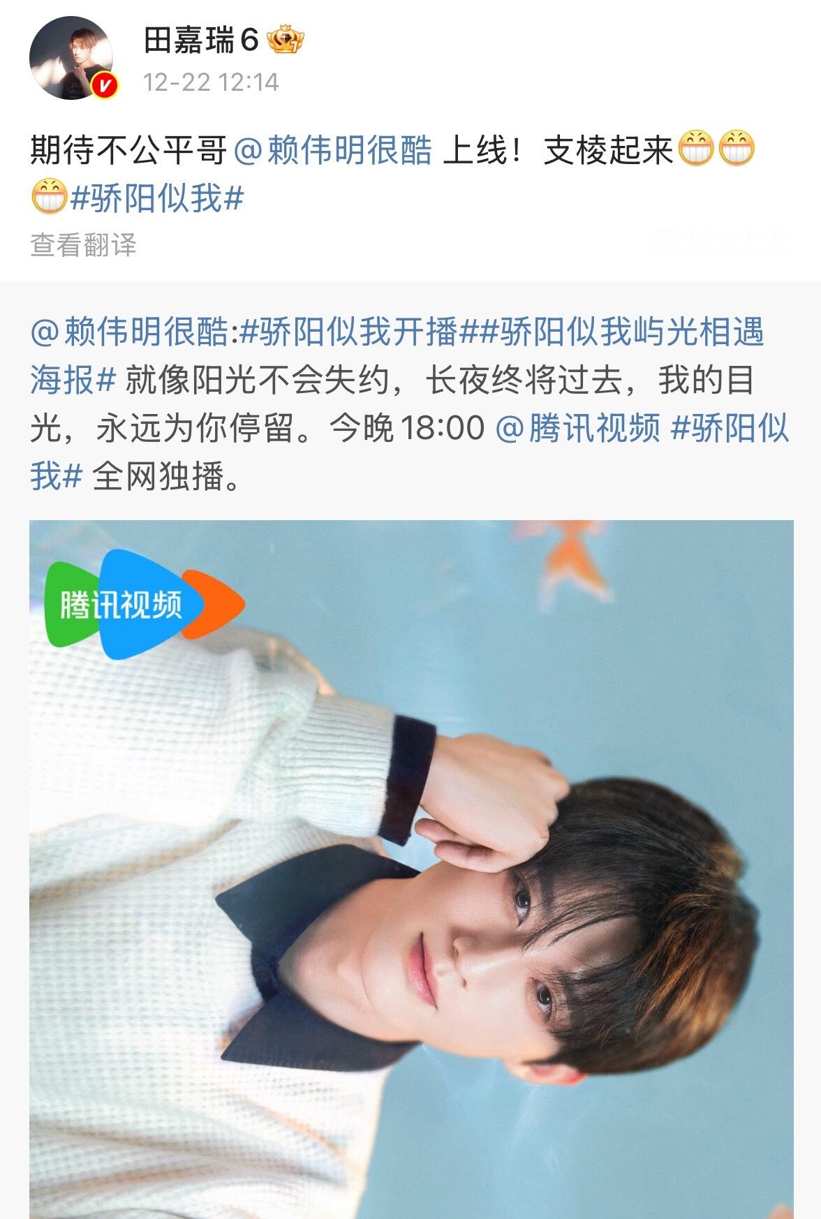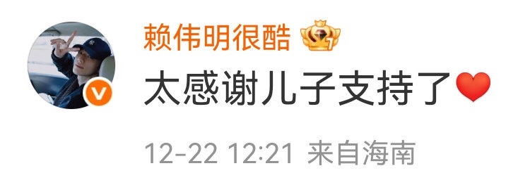 田嘉瑞宣传赖伟明新剧赖伟明回复:“太感谢儿子支持了”随后删除改成了:“谢谢我哥支持,感谢的心是认真的!”田嘉瑞回复:“太难了咱们”赖伟明删除给田嘉瑞的评论*赖伟明 太感谢儿子支持了