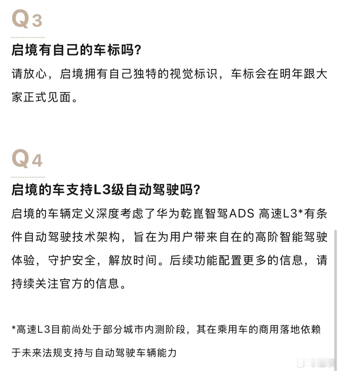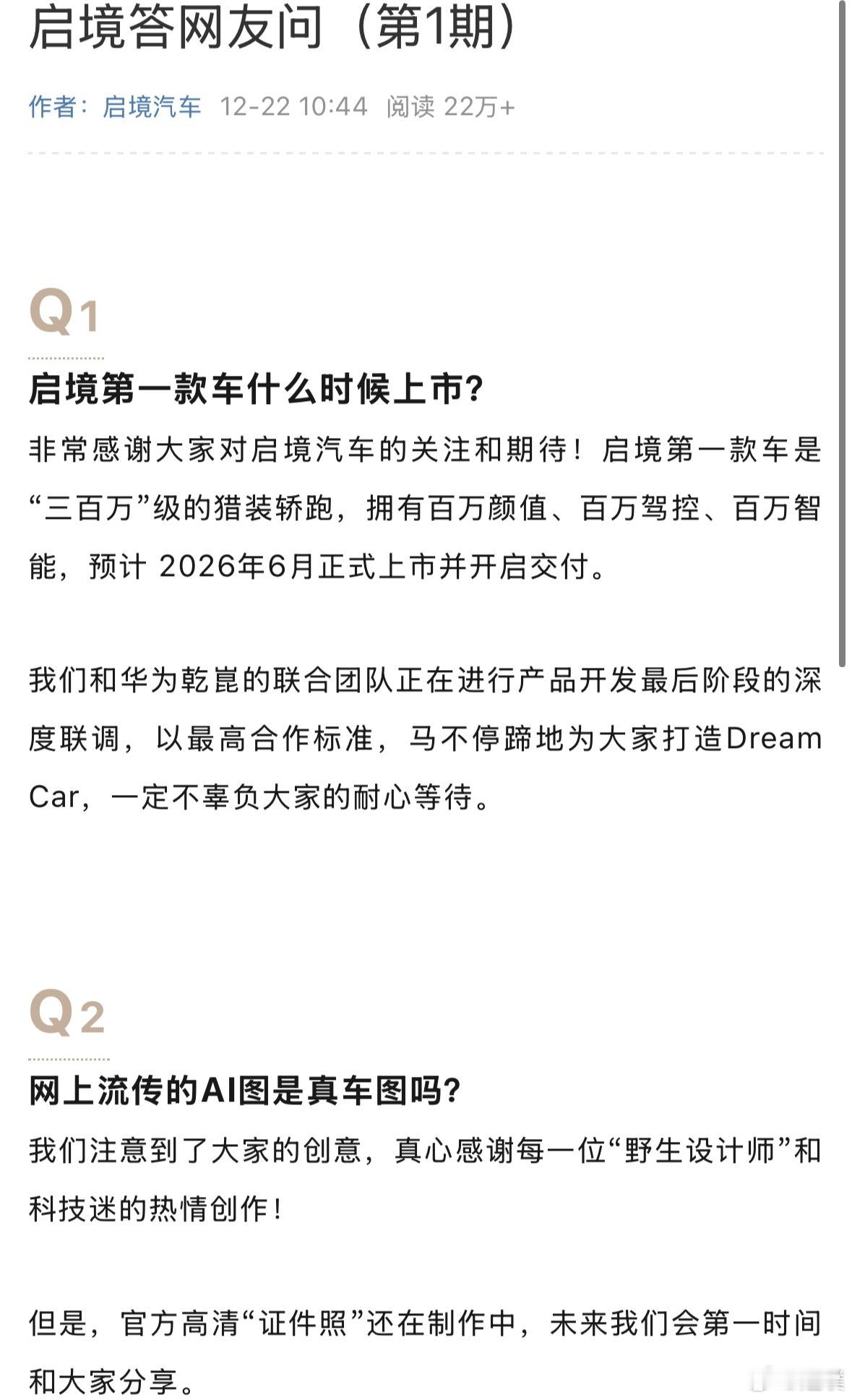 广汽华为联合打造的“启境”汽车最新进展:第一款车定位“三百万”级猎装轿跑,深度考虑了华为乾崑智驾ADS 高速L3有条件自动驾驶技术架构,预计 2026年6月正式上市并开启交付。启境汽车