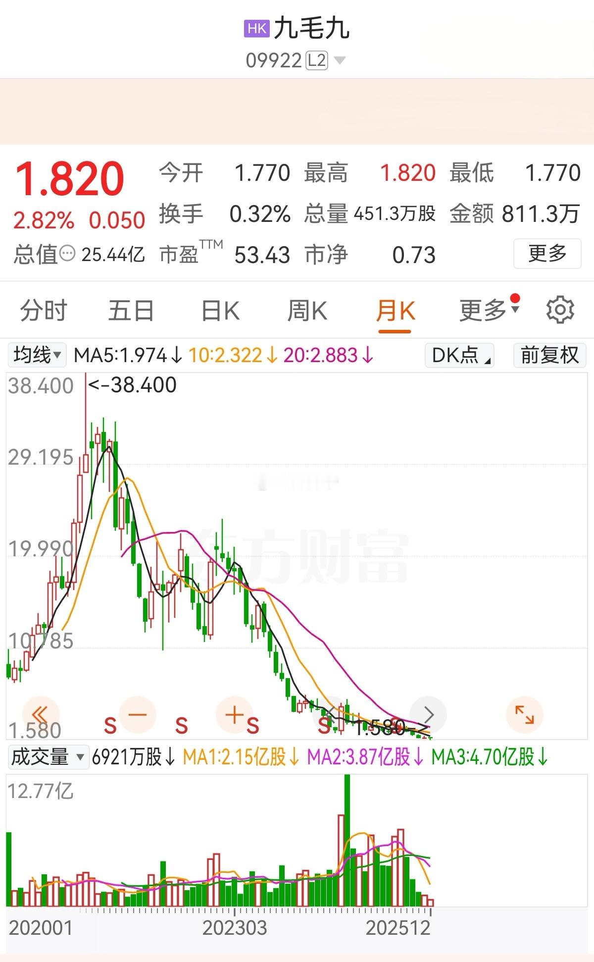 【九毛九】旗下“太二”定位变化:从“酸菜鱼专门店”到“鲜料川菜”。【九毛九】之前依靠“太二酸菜鱼”,打出了一片新天地,股价最高升到38.4港币,但现在已经跌去逾9成,今日收盘仅1.8港币。