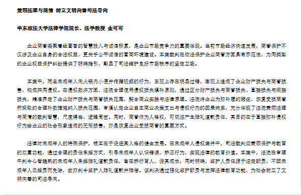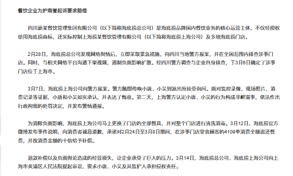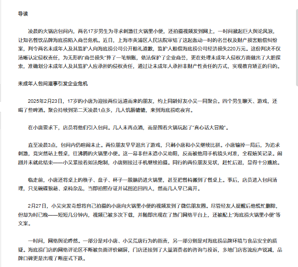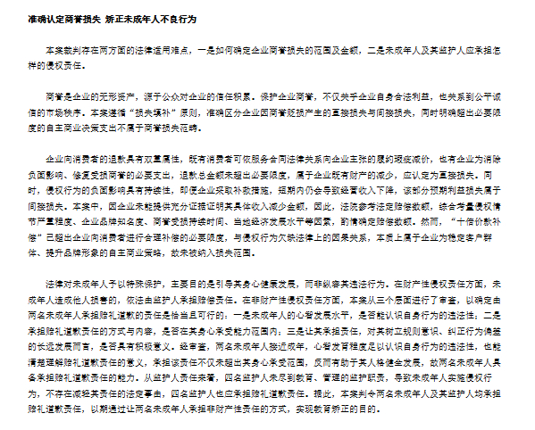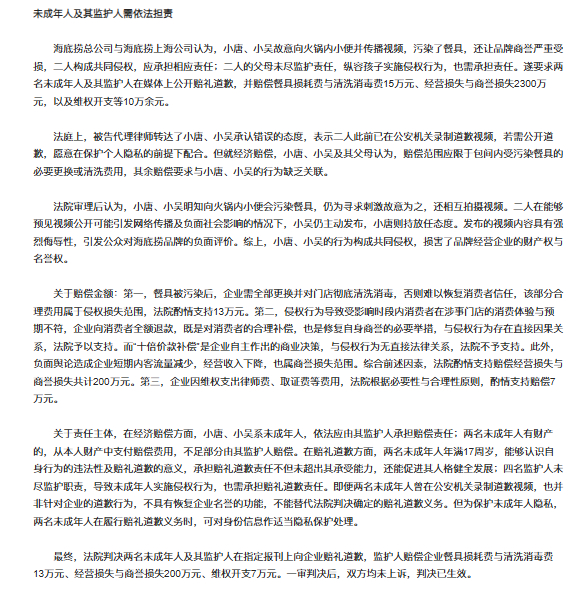 本案裁判存在两方面的法律适用难点,一是如何确定企业商誉损失的范围及金额,二是未成年人及其监护人应承担怎样的侵权责任。220万,对于海底捞的声誉来说并不够,但希望这种案例应该多推广宣传,成为警示案例……海底捞小便事件家长赔偿220万元热点观点 海底捞小便事件家长赔偿220万元