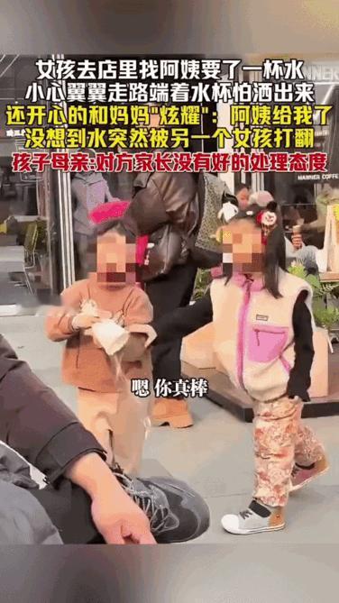 小女孩双手捧着店员给的水,满心欢喜。旁边突然伸过来一只手,故意打翻了杯子。视频里,水洒了一地,小女孩愣住了。 最让人心寒的是后续。打翻水的孩子家长,连句像样的道歉都没有。仿佛那只是一杯水而已,擦了就行。 可那不仅仅是一杯水。那是孩子的善意被践踏,是公共场所最基本的尊重被无视。很多家长总觉得“小孩打闹而已”,却忘了自己每一次的态度,都在给孩子上重要的一课。 你教会他推卸责任,他以后就学会漠视他人;你教会他及时道歉,他以后就懂得换位思考。那一杯水洒在地上很快会干,但有些印记,可能会留很久。 教育就藏在这些瞬间里。孩子看着呢。