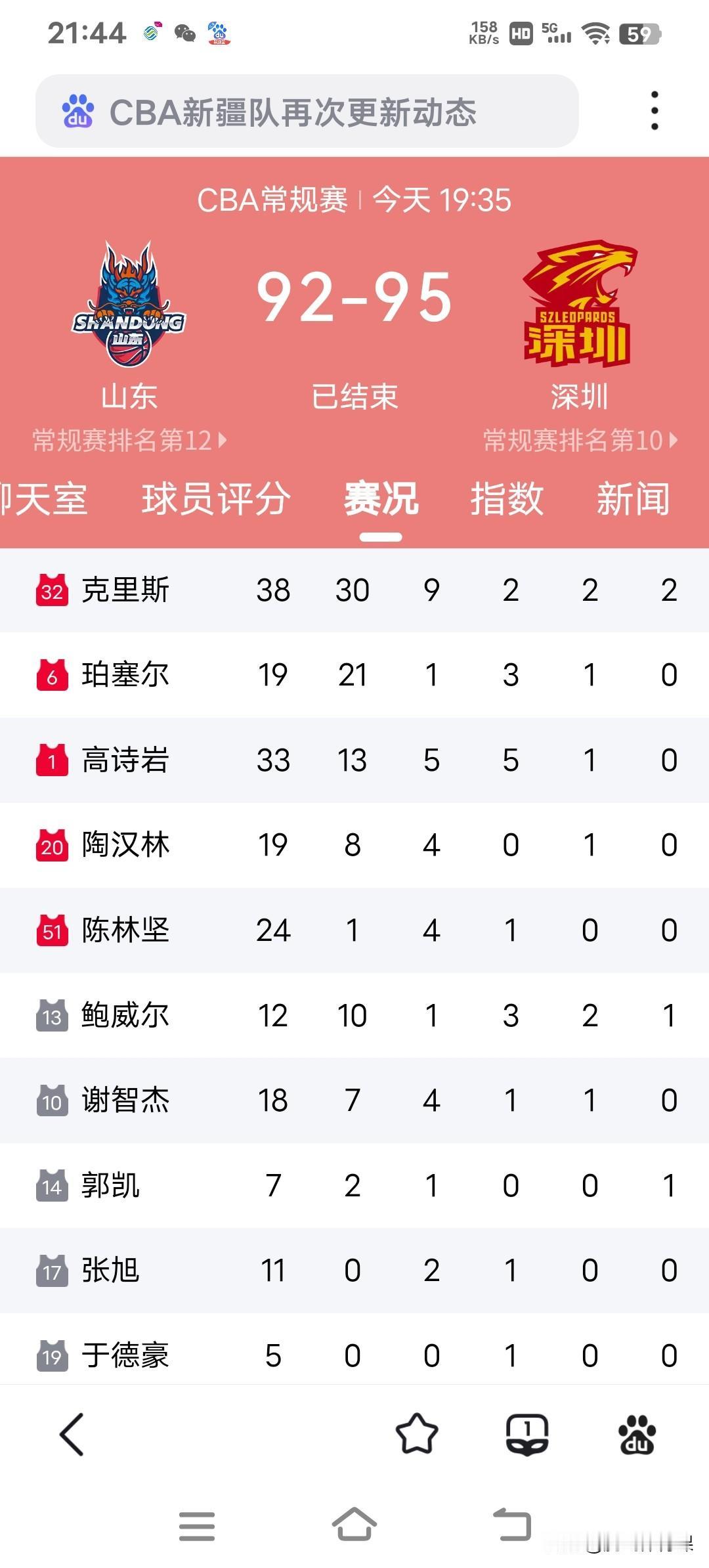 山东主场92:95被深圳绝杀,这四人是输球最大卧底: 1.于德豪--出场5分钟,贡献数据全部是0,还因为假摔赔了对方一个罚球。 2.陈林坚--出场24分钟,仅贡献1分4篮板1次助攻。 3.张旭--出场11分钟,仅抢了2个篮板,送出1次助攻,一分未得。 4.陈培东--出场6分钟,仅1次助攻,其他数据都是0,曾经的三分球投手已经彻底沦为球队边沿球员。 山东队账面上阵容豪华,实力球队之间的化学反应效率太低,冲击季后赛难度非常大。