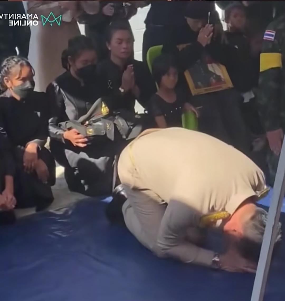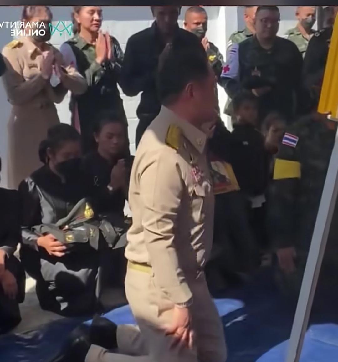 12月22日,阿努廷吊唁前线阵亡战士了,能看出来他的压力不小,表情很沉重。 阿努廷穿着浅绿色工作制服,戴着手表,双手合十,跪地磕着头,表达着对伤亡战士的悼念,能看出很悲伤。 阿努廷身后是伤亡战士的家属,他们穿着黑色礼服,戴着黑色口罩,拿着遗像,眼神里充满着无助。