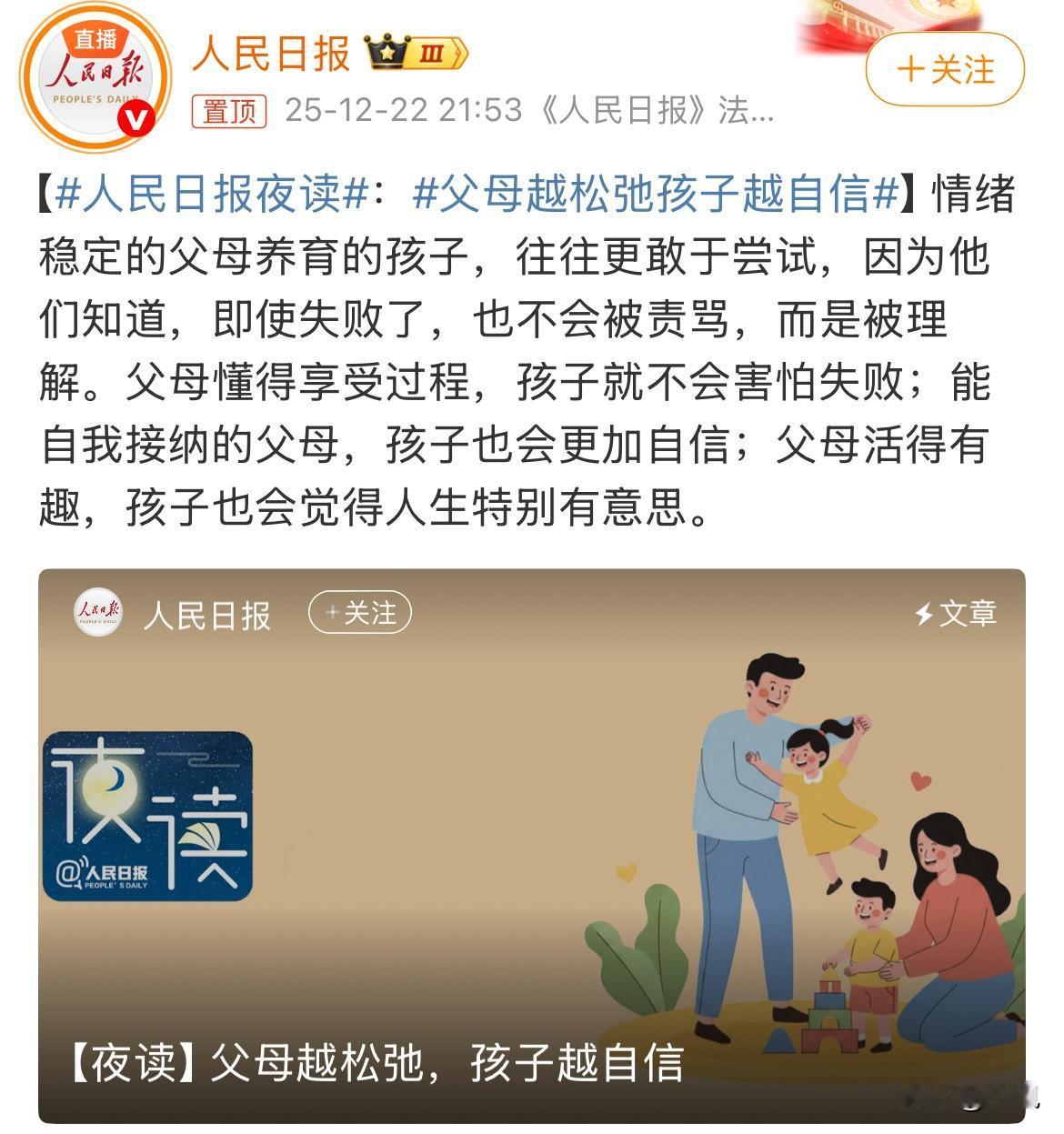 刚在电梯里遇见一对母子。小男孩大概打翻了牛奶,衣服湿了一大片,低着头等骂。结果他妈妈蹲下来看了看,居然笑了:“哇,这图案像不像一只小恐龙?”男孩愣了两秒,自己也跟着笑了。 忽然想起我们这代人小时候,摔个碗能紧张半天。现在很多父母真不一样了,不是要求松了,是整个人松弛了。 这种松弛感太珍贵了。它不是放任,而是一种稳稳的接住。孩子考试考砸了,不是天塌了的事;把颜料洒在地板上,可以一起蹲下来研究像什么云。错误不再是需要遮掩的耻辱,而是生活中平常的褶皱。 我朋友就是这样养孩子的。有次她女儿把面粉撒得满厨房都是,她第一反应居然是拿出手机拍照:“快来,我们一起堆个面粉雪山。”那个下午厨房成了游乐场,孩子眼睛亮亮的。现在这孩子特别敢尝试新东西,学滑板摔了也不哭,自己爬起来说“再来一次”。 松弛的父母就像安全网。孩子知道哪怕掉下去也不会摔碎,所以敢放手去探索。那些被稳稳爱着的孩子,身上有种不怕错的底气。 这种家庭长大会是什么样?大概是遇到困难不会第一时间自我攻击,谈恋爱不焦虑配不配得上,选工作不只为证明自己。他们活得更像树,按照自己的节奏生长,不用拼命向谁证明枝叶够不够茂盛。 最难得的是,这种松弛会传递。见过那种总说“没事儿”的老人带孙子吗?整个家都暖洋洋的。紧绷的父母教孩子规避风险,松弛的父母教孩子享受过程。而人生这场马拉松,会享受过程的人,往往跑得更远更从容。 说到底,父母能给孩子最深的祝福,或许不是“你要成功”,而是“失败了也可以”。当家的意义不是完美的展示柜,而是随时可以跌进去的沙发——这样长大的孩子,一辈子都有底气。 他们接住的不是错误,而是那个慌慌张张的自己。这大概就是最好的土壤了。