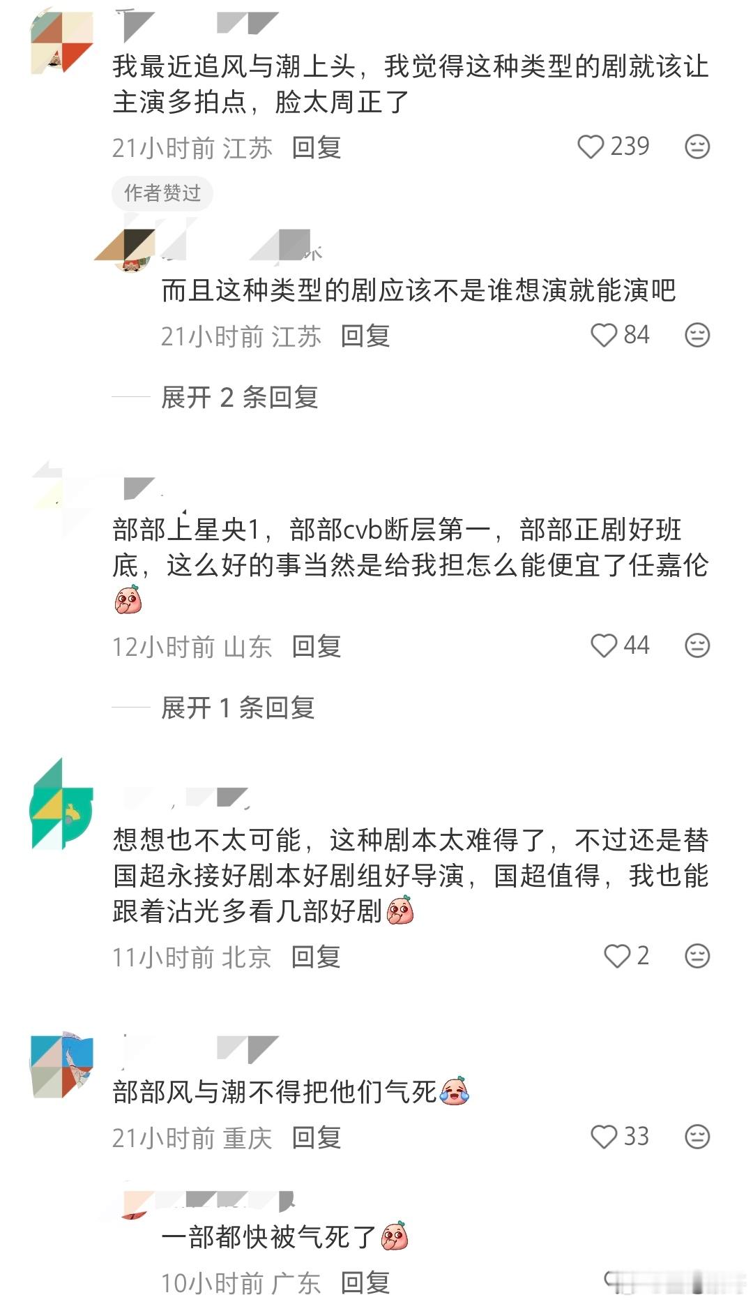 确实没有人祝任嘉伦部部风与潮,因为他们也想让自家哥哥演这种班底和质量的剧,万一国超以后部部都这种质量和水平,他们哥哥演啥