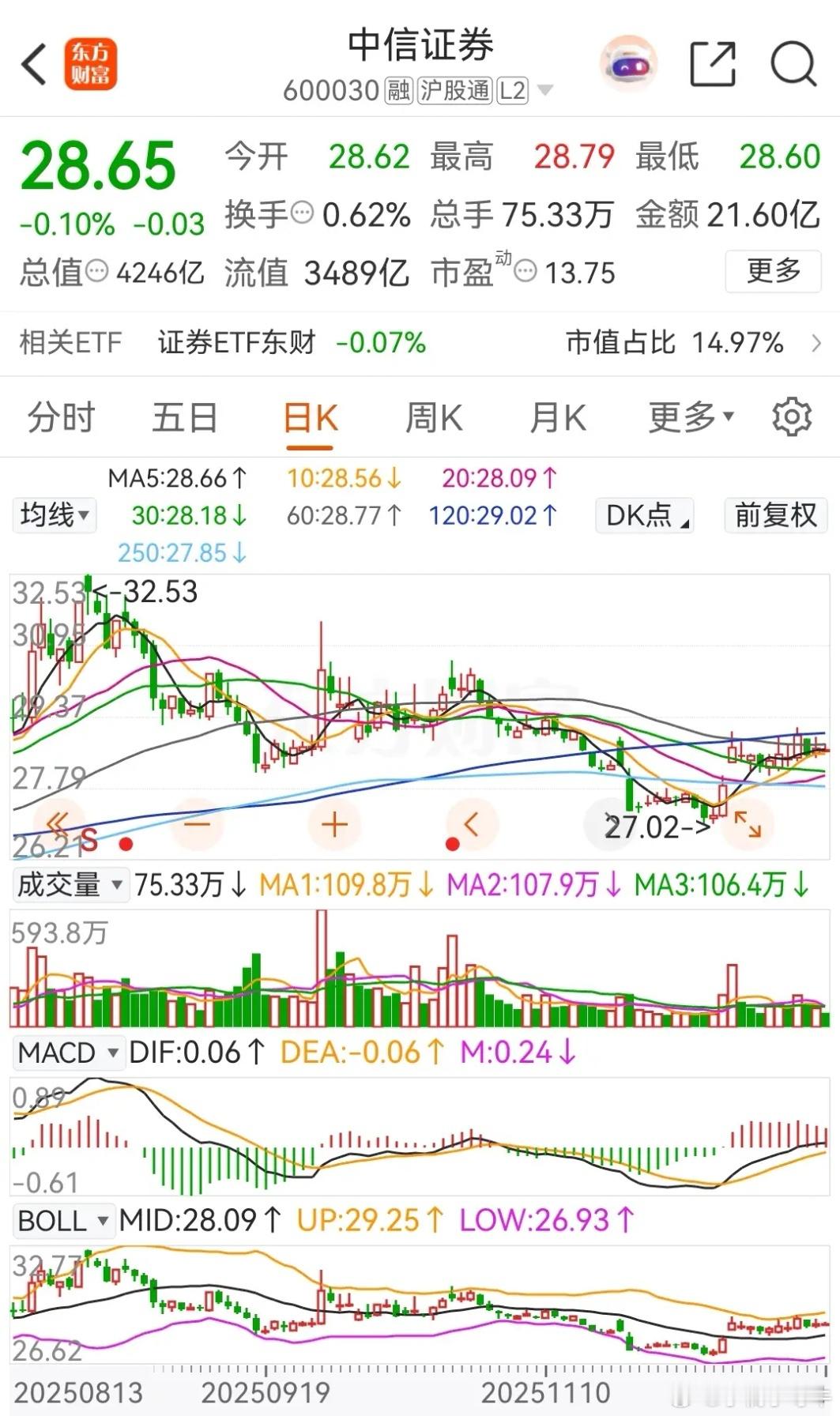 东方财富今日低开高走,收出了一颗缩量小阳星,且被主力资金净卖出。而中信证券则是低