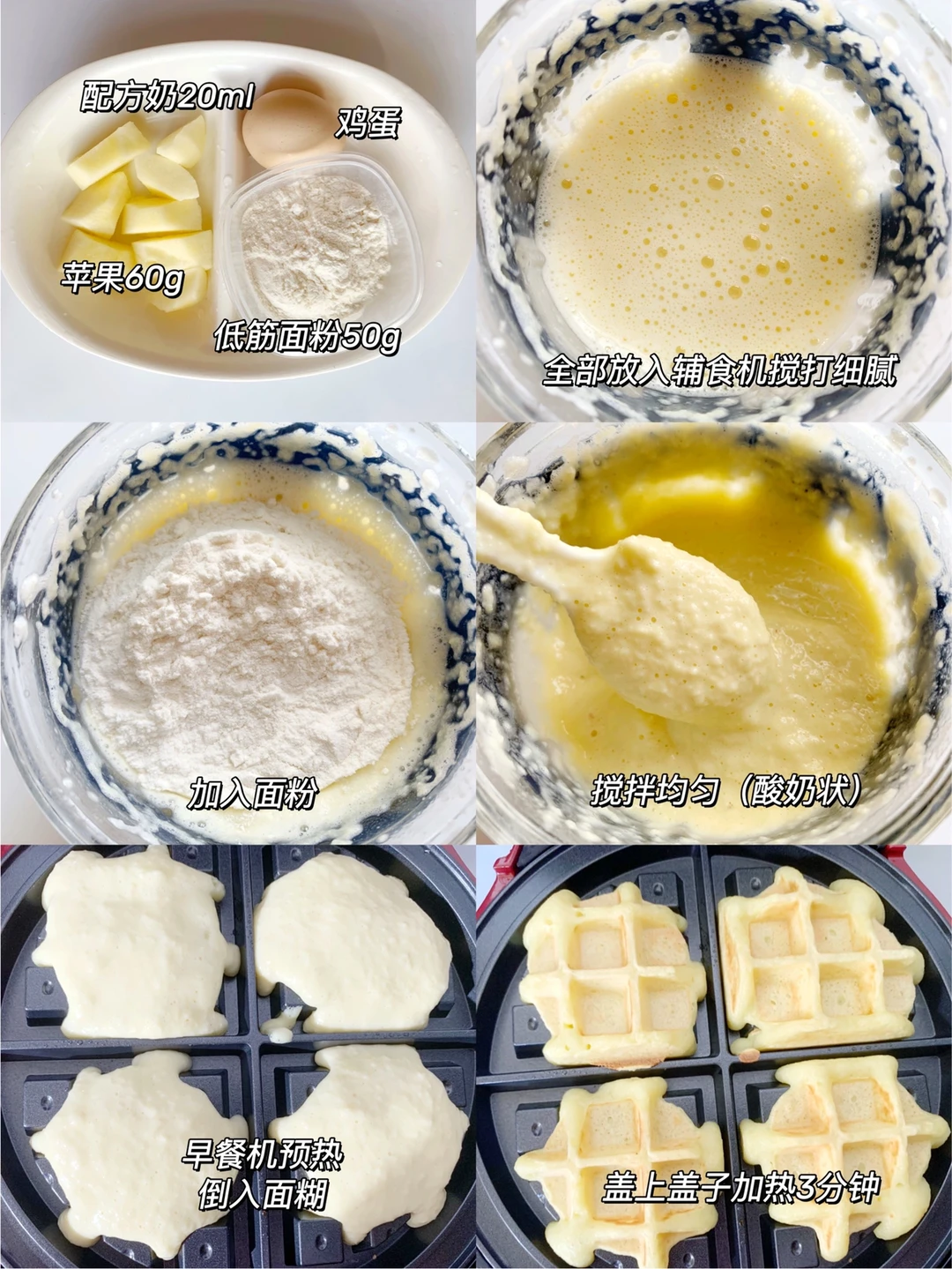 华夫饼不仅做法简单而且也很好吃😋 可以给宝宝当早餐或者点心都很不错哦,香甜可口,超松软,十分钟就可以搞定 ~~~~ 🌟食材 苹果60克、配方奶20毫升、低筋面粉50克,鸡蛋 . 🌟做法: 1⃣️全部食材放入辅食机搅打细腻,加入面粉搅拌均匀(酸奶状) 2⃣️早餐机预热,倒入面糊,盖上盖子加热3分钟即可 8个月宝宝辅食|9个月宝宝辅食|10个月宝宝辅食|一岁宝宝辅食 ❤️有什么问题可以在下方留言,看到都会回复,关注我带您解锁更多辅食制作…