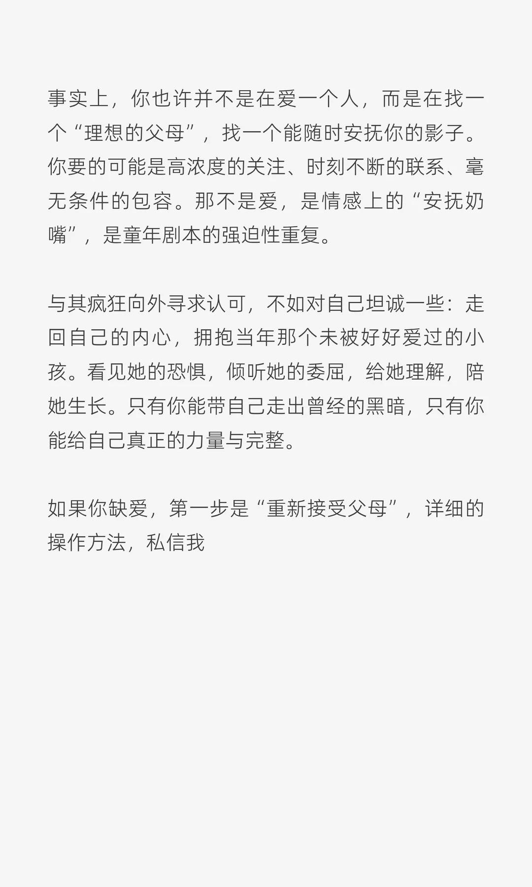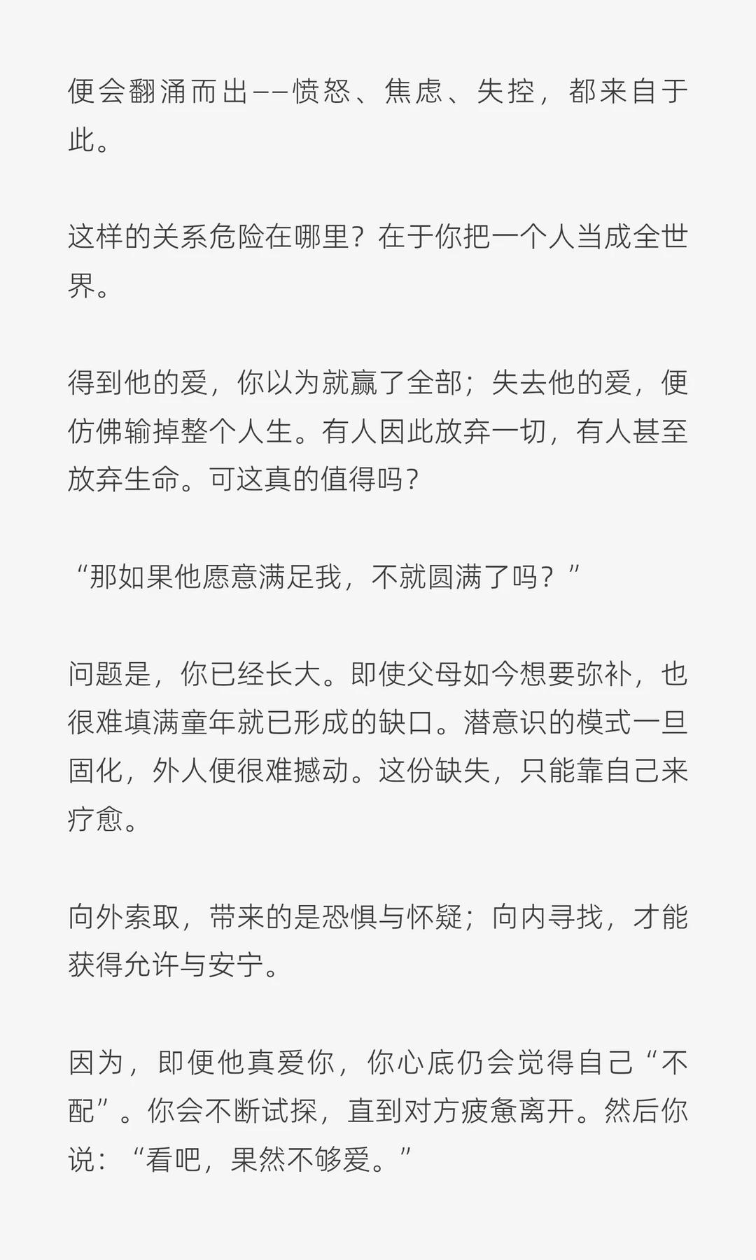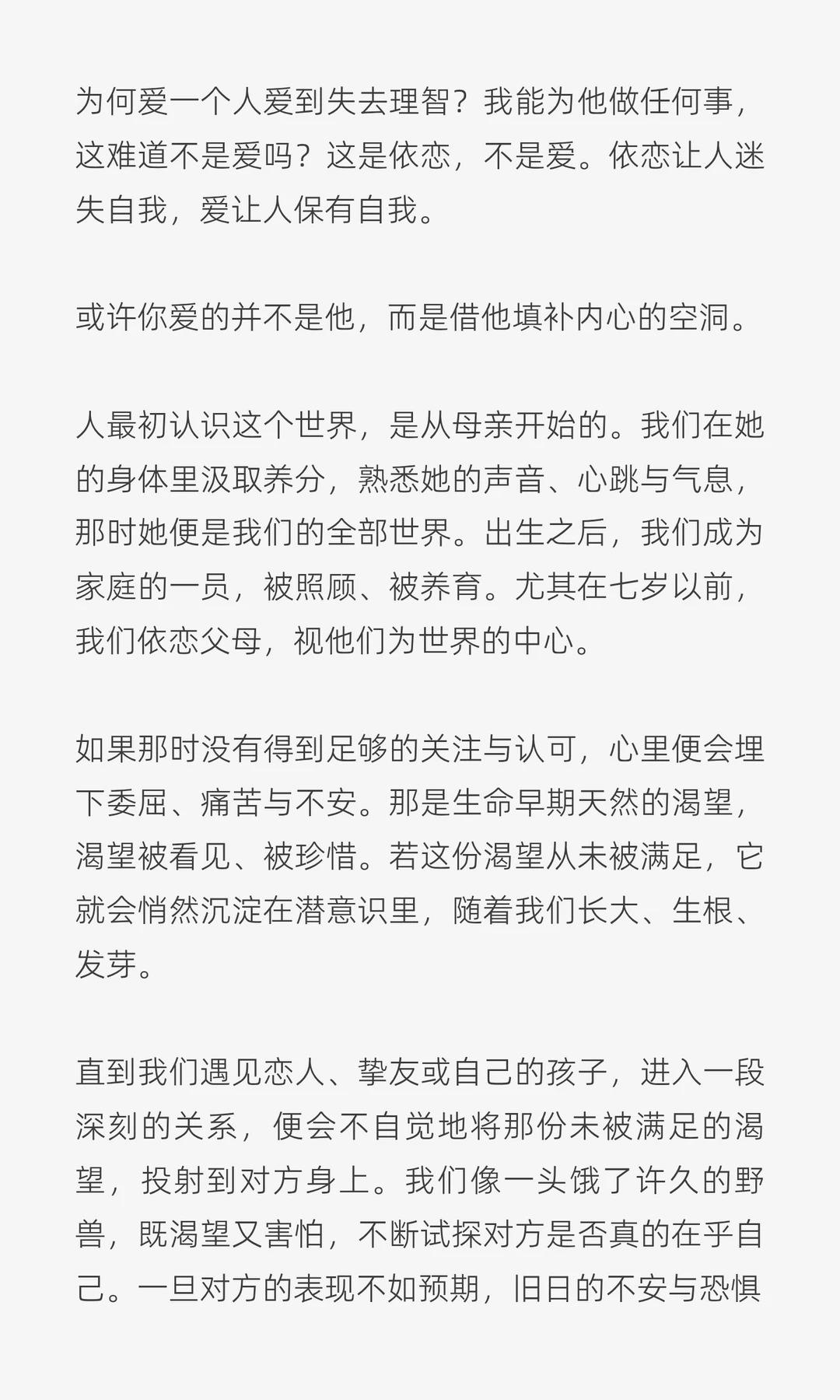 为什么你会发疯的爱一个人,爱到失去理智。为何爱一个人爱到失去理智?我能为他做任何事,这难道不是爱吗?这是依恋,不是爱。依恋让人迷失自我,爱让人保有自我。 或许你爱的并不是他,而是借他填补内心的空洞。 人最初认识这个世界,是从母亲开始的。我们在她的身体里汲取养分,熟悉她的声音、心跳与气息,那时她便是我们的全部世界。出生之后,我们成为家庭的一员,被照顾、被养育。尤其在七岁以前,我们依恋父母,视他们为世界的中心。 如果那时没有得到足够的关注与认可,心里便会埋下