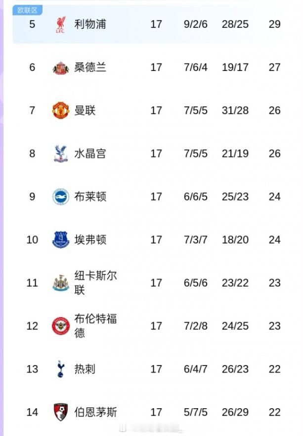 英超第17轮过后,第4切尔西-第14名伯恩茅斯之间仅相差7分,第7曼联-第14伯恩茅斯之间仅差4分。