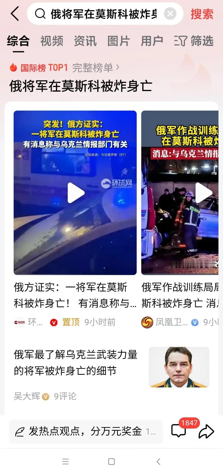 俄将军在莫斯科被炸身亡! 有消息说与乌克兰有关。 现乌克兰方没承认! 如真是乌克兰所为,只能说明乌方的情报也不差,潜入俄首都完成目标! 但是俄罗斯内部之前暗杀、刺杀成功的事情也多! 不排除内部有其它因素的可能性! 静待俄、乌双方后面的说法!