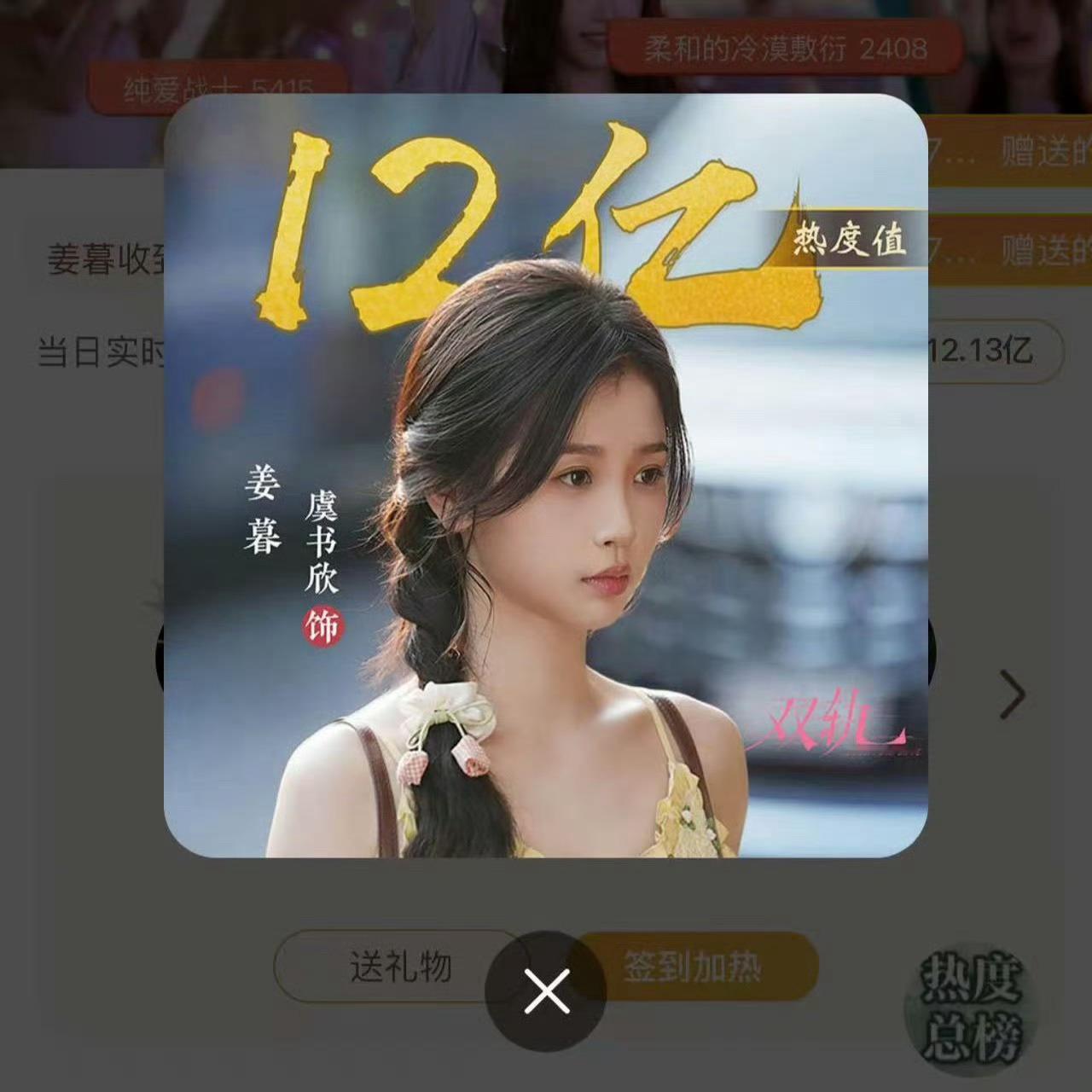 恭喜虞书欣《双轨》爱奇艺姜暮角色热度值破12亿,演技好,质量高,口碑有,热度火,镜头美学天花板! 虞书欣说感谢大家参加暮暮朝朝婚礼