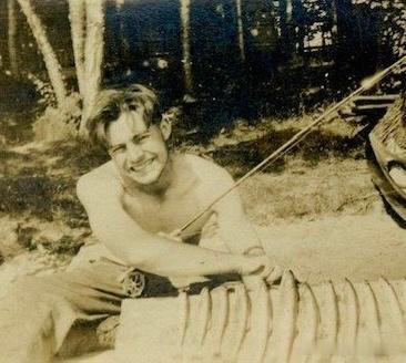 1916年,17岁的海明威对着镜头炫耀自己的钓鱼成果