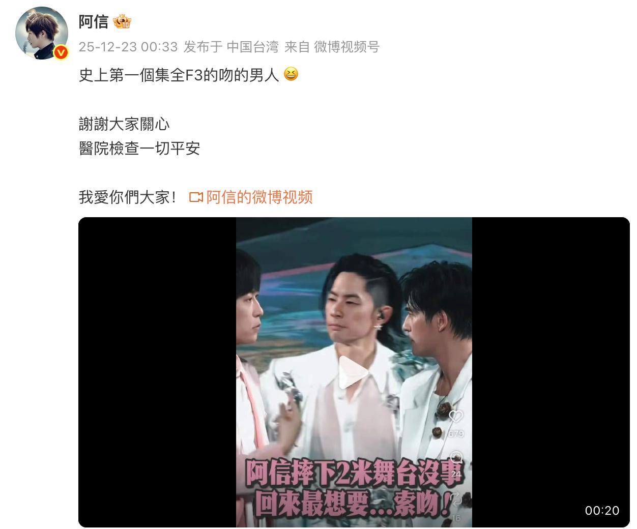 阿信报平安阿信医院检查一切平安 23日凌晨,阿信摔下舞台后发博报平安,“谢谢大家关心,医院检查一切平安。”