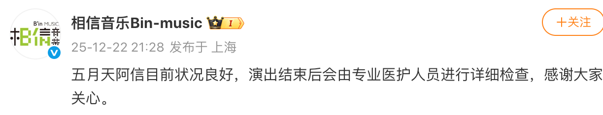 相信音乐报平安相信音乐替阿信报平安 刚刚,发文替报平安:“五月天阿信目前状况良好,演出结束后会由专业医护人员进行详细检查,感谢大家关心。 ”