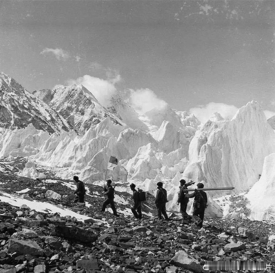 1970年,中国科学工作者在珠穆朗玛峰地区跋涉进行测绘工作